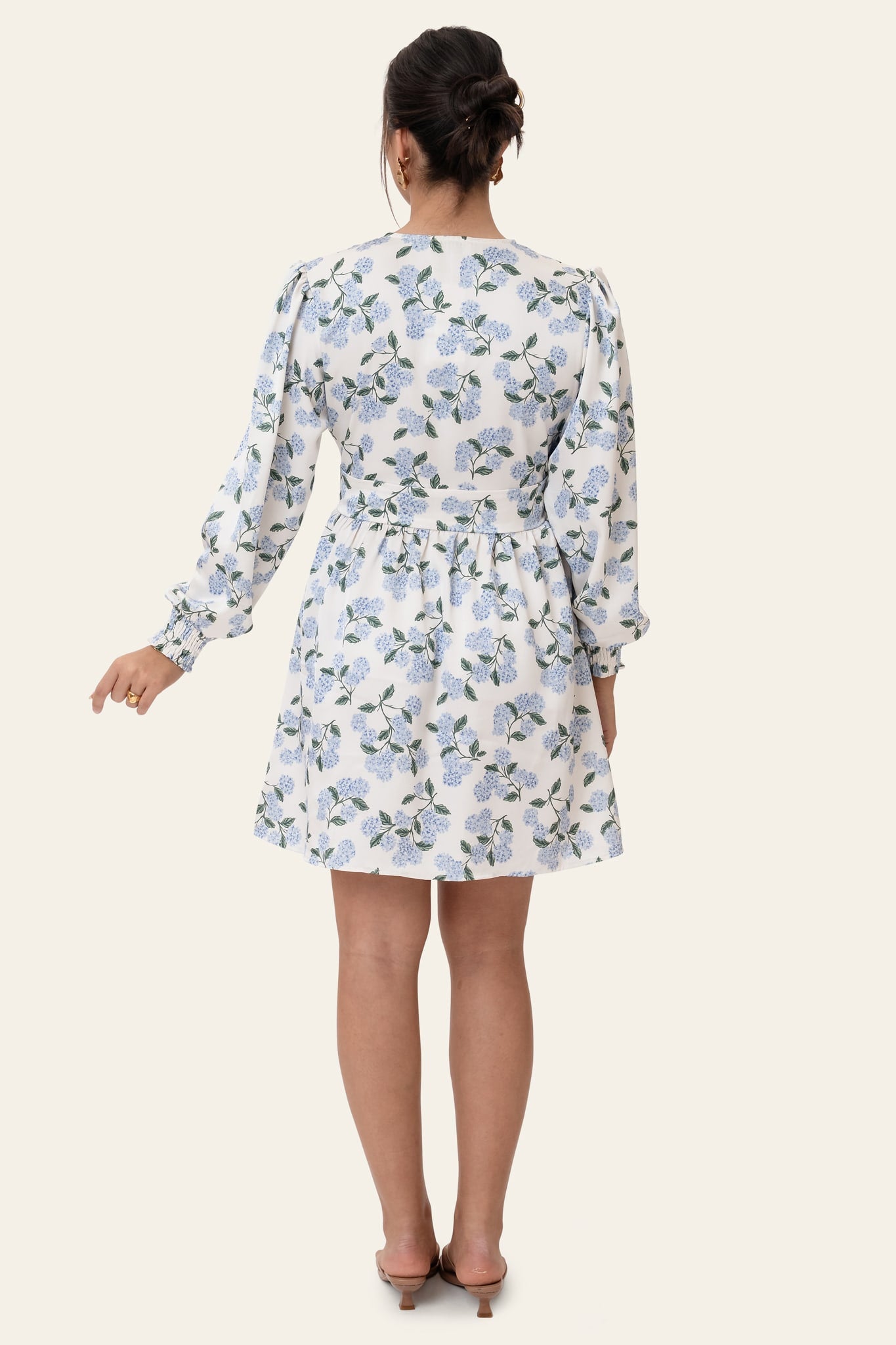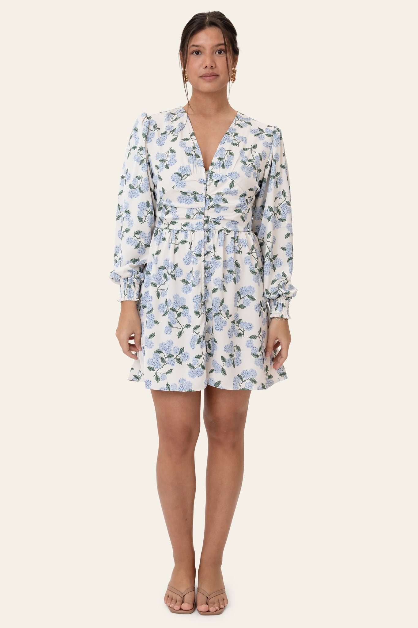 Vacker kort klänning i blått hortensiamönster med långa ärmar. Klänningen har V-ringning och knappar hela vägen ner fram för stängning. Den har en åtsittande silhuett runt byst och midja, med en lösare passform nedtill. Ärmarna har resår i ärmsluten, vilket gör att de kan dras upp för en kortare look.