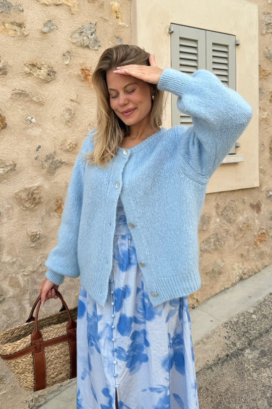 Vacker lång klänning i ett abstrakt blått blommönster med långa ärmar. Klänningen har V-ringning och knappar hela vägen ner fram för stängning. Den har en åtsittande silhuett runt byst och midja, med en lösare passform nedtill. Ärmarna har resår i ärmsluten, vilket gör att de kan dras upp för en kortare look.