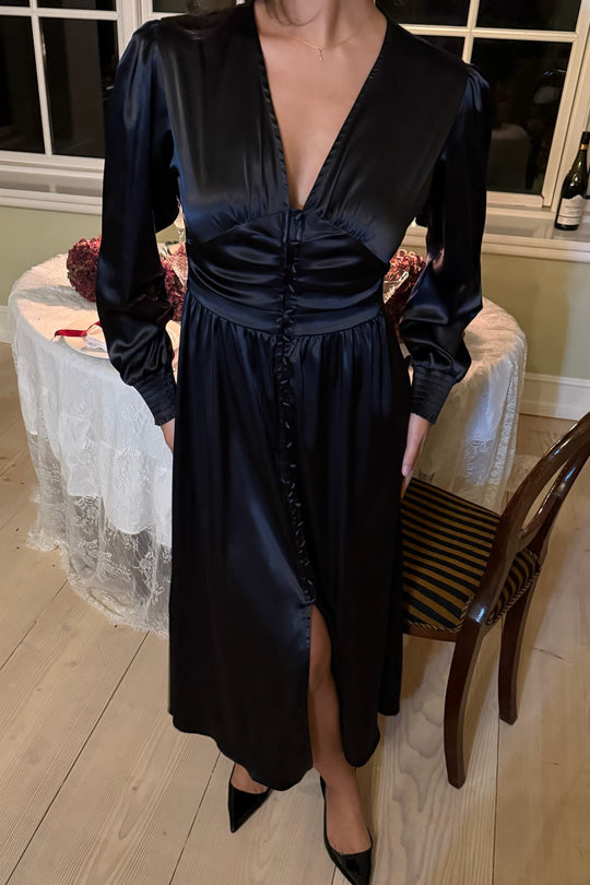 En elegant midiklänning i glansig svart satin, designad med vackra feminina detaljer. Klänningen har en smickrande passform med en definierad midja och mjukt draperad framtill, vilket framhäver figuren på ett sofistikerat sätt. Den djupa V-ringningen och de långa ärmarna med smockade manschetter skapar en romantisk och tidlös look. Framsidan är prydd med små, tygklädda knappar som löper hela vägen ner och slutar i en subtil slits som ger rörelse och en elegant touch. Det mjuka, lätt glansiga satintyget faller vackert och ger klänningen en exklusiv känsla – perfekt för både speciella tillfällen och festliga kvällar. Ärmarna har resår i manschetterna, vilket gör att de kan dras upp för en kortare look. Styla den med klackar och en enkel kuvertväska för en klassisk, sofistikerad look – eller med stövlar för ett mer modernt uttryck.
