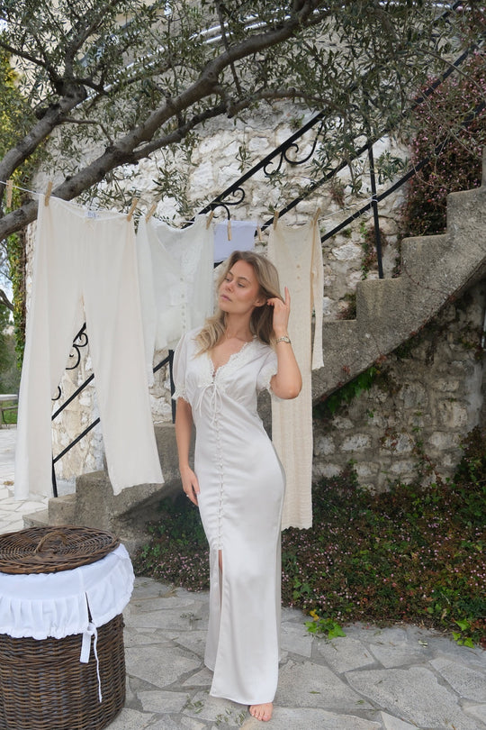 Vacker lång klänning i off white. Klänningen har korta puffade ärmar och V-ringning, båda prydda med spetsdetaljer. Den har en figursydd siluett runt bysten och midjan, med en lösare passform nedtill. Dessutom har klänningen en knytdetalj vid bysten och knappar som går halvvägs ner framtill, vilket skapar en slits nedtill för en elegant look.