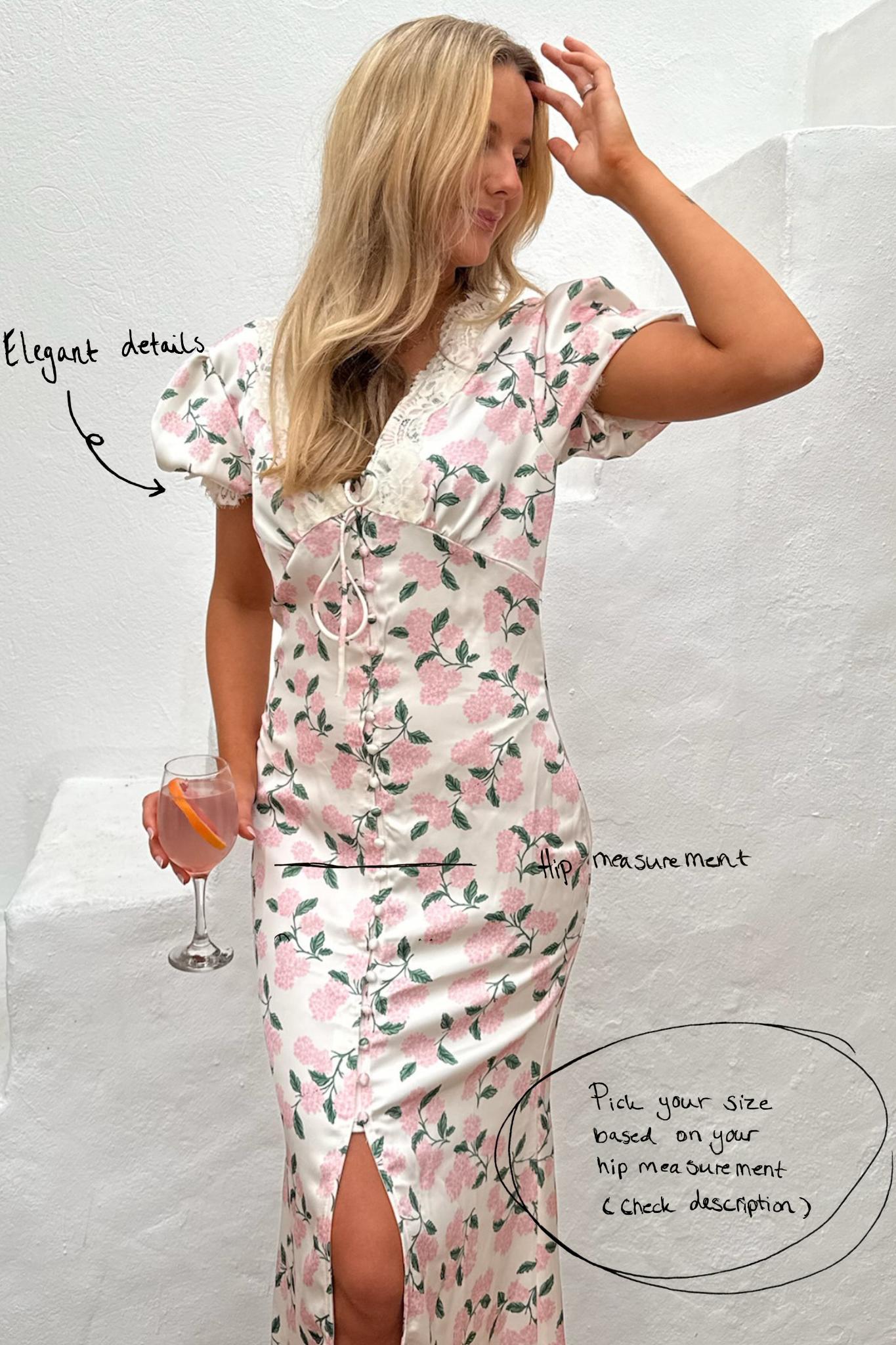 Vacker långklänning i rosa hortensiatryck. Klänningen har korta puffade ärmar och V-ringning, båda prydda med spetsdetaljer. Den har en figursydd siluett runt bysten och midjan, med en lösare passform nedtill. Dessutom har klänningen en knytdetalj vid bysten och knappar som går halvvägs ner framtill, vilket skapar en slits nedtill för en elegant look.