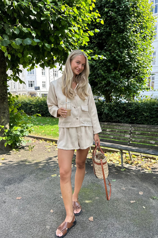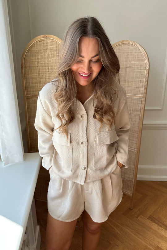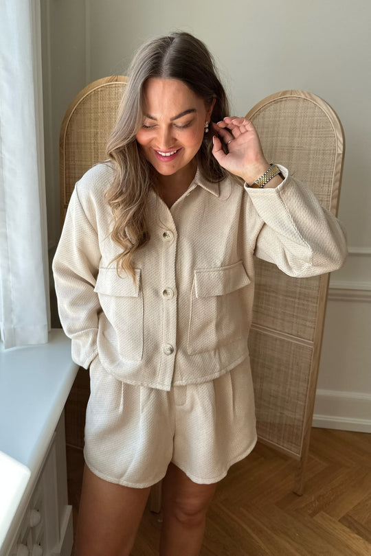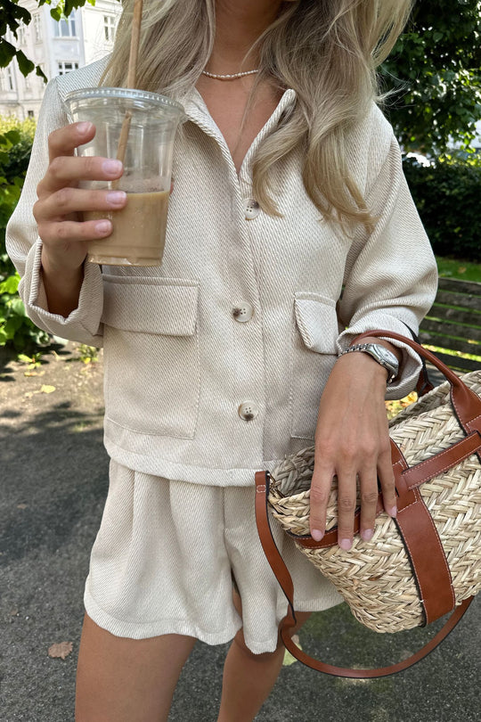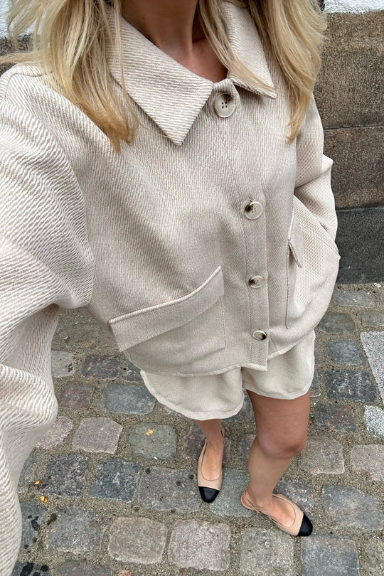 Beige jacket with two big front pockets and four buttons down the front.