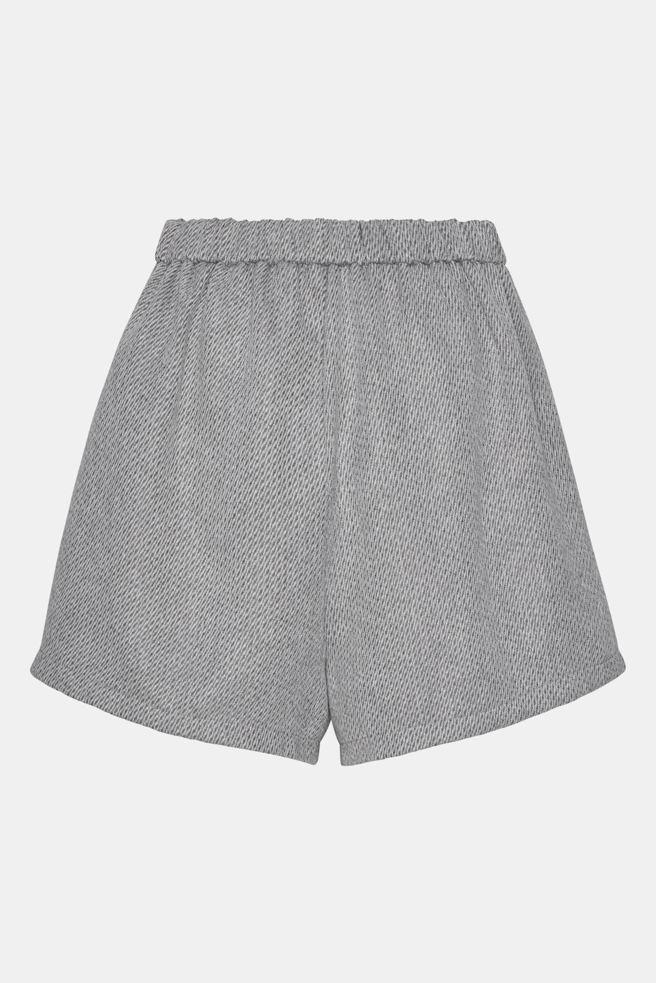 Grey oversized shorts with rubberband and a zipper, match it with a blazer or shirt.