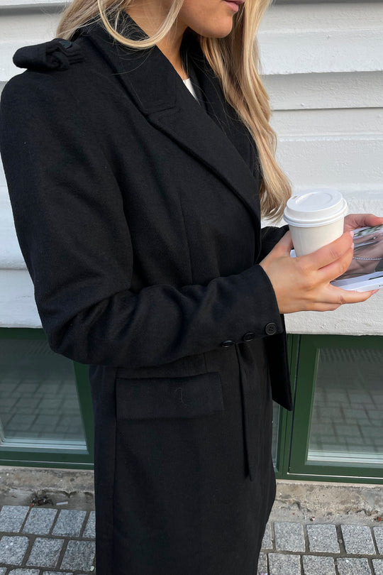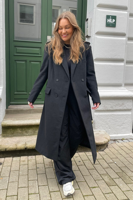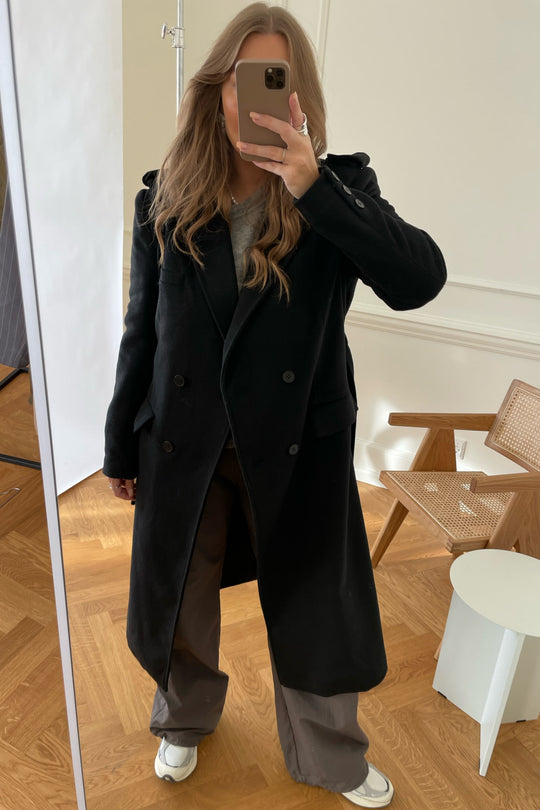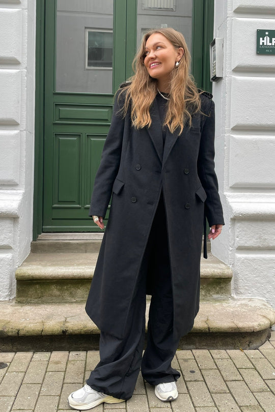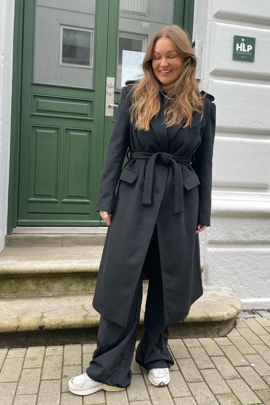 Comfy wool jacket for fall with buttons and waistband for closure.