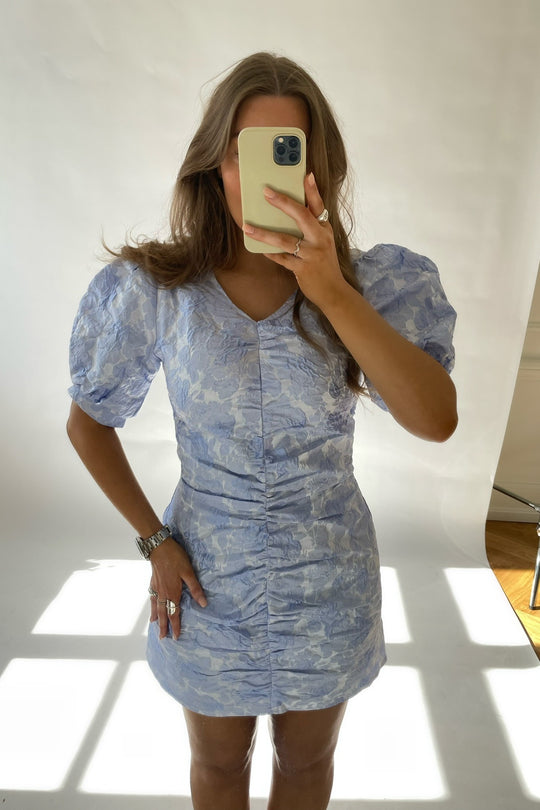 Beautiful blue dress with puff sleeves and zipper closure on the back.