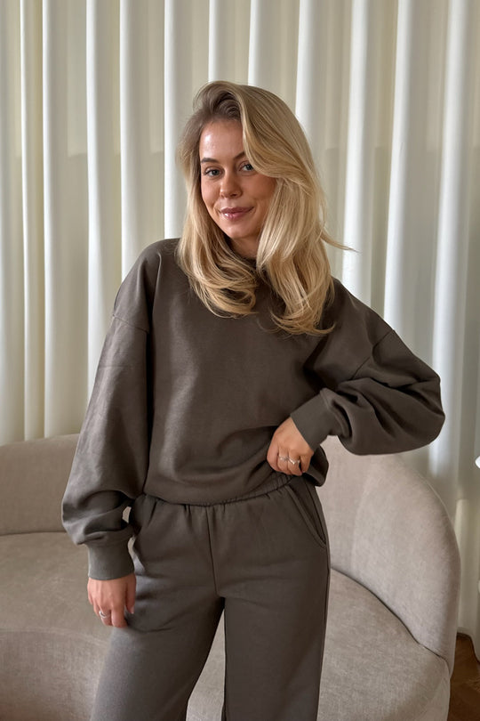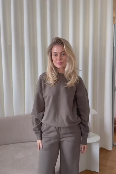 Crew neck sweatshirt with a soft feel inside, rib details and a discreet logo on the back. Match it with the Ally pants.