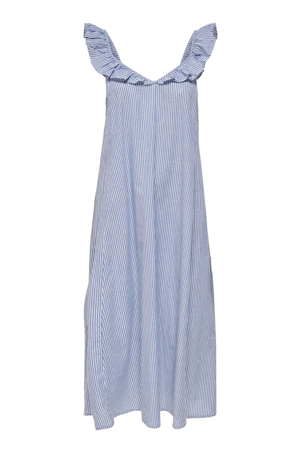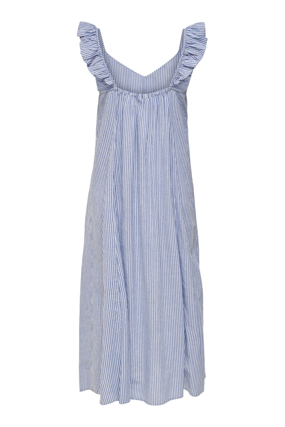 Light, summerdress in blue and white with ruffle details on the straps.