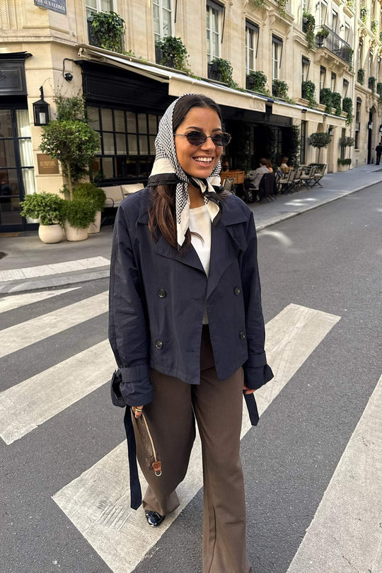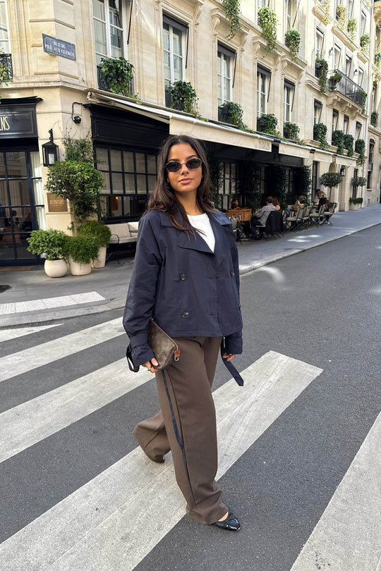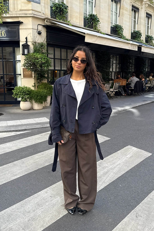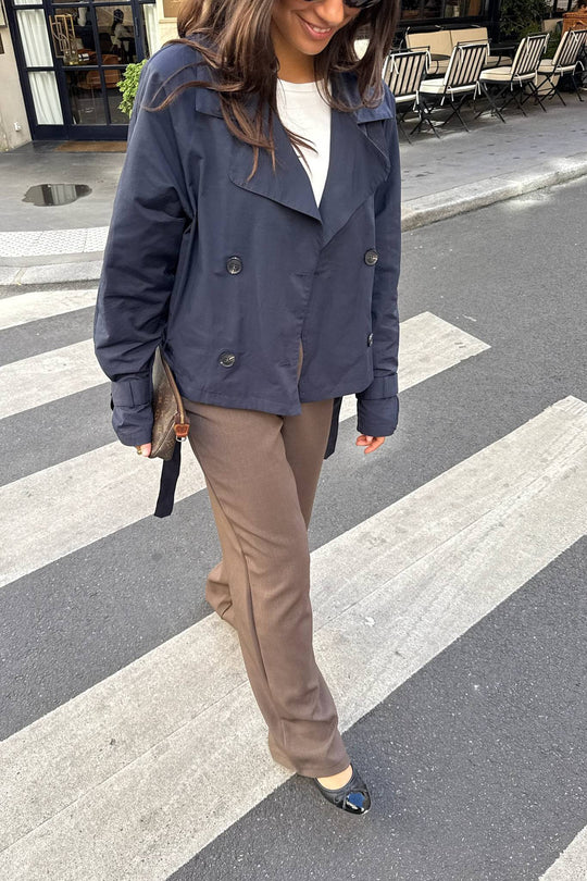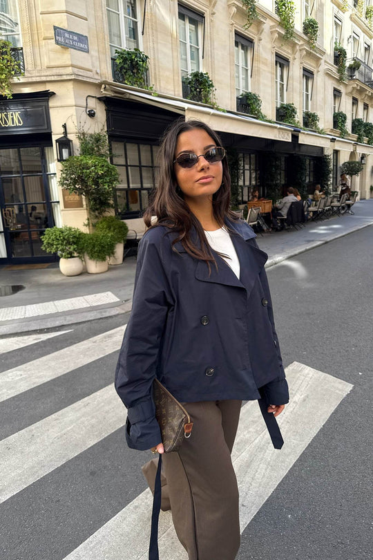 Kort trenchcoat i marinblå med lös passform. Trenchcoaten har naturfärgade knappar framtill för stängning och remdetaljer på ärmarna som även knäpps med en knapp. Trenchcoaten har knytband runt midjan och fickor.