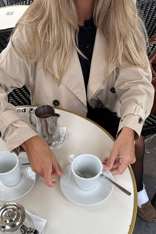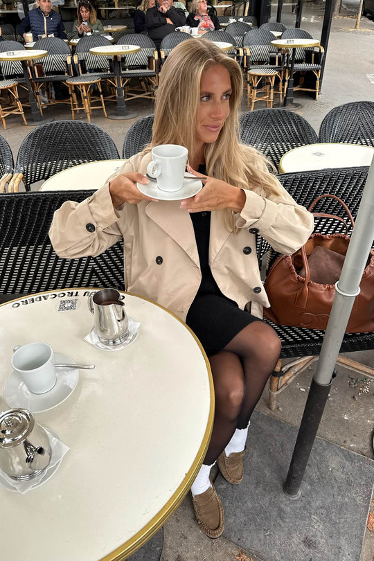 Kort trenchcoat i sand med lös passform. Trenchcoaten har naturfärgade knappar framtill för stängning och remdetaljer på ärmarna som även knäpps med en knapp. Trenchcoaten har knytband runt midjan och fickor.