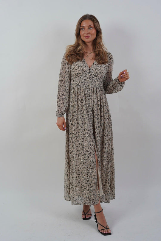 Long dress in beige and brown colors, a slit on the front, slim around the waist and buttons as closure.