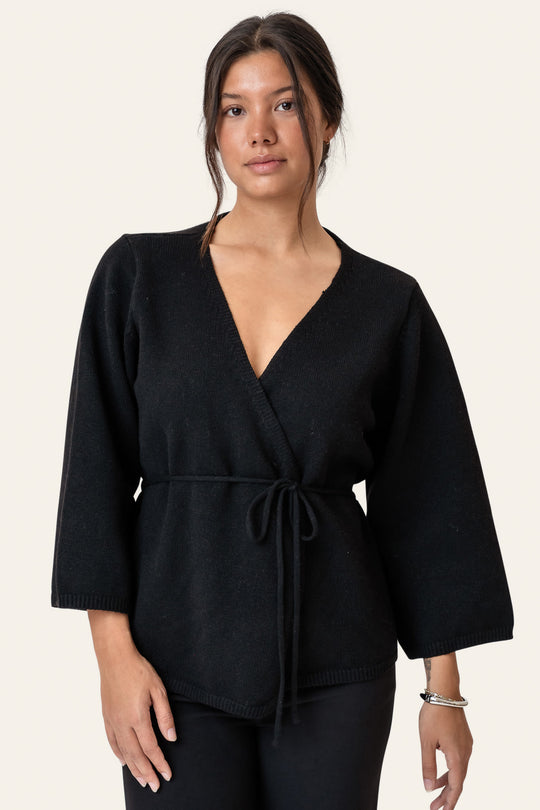 Vacker omlottkofta i svart. Denna kofta stängs framtill med en omlottfunktion, vilket skapar en smickrande V-ringning. Den knyts i midjan med ett elegant, smalt bälte som framhäver midjan. För en mer boxig look kan du knyta bältet lösare. Koftan har vida 3/4-ärmar med en smal, elegant ribbad mudd. De återstående kanterna är också avslutade med en smal ribbdetalj för en extra raffinerad touch.