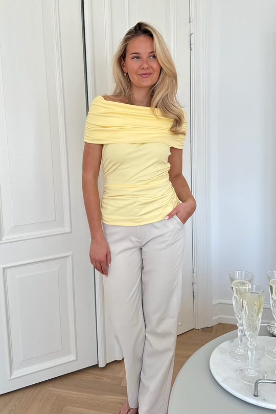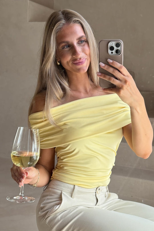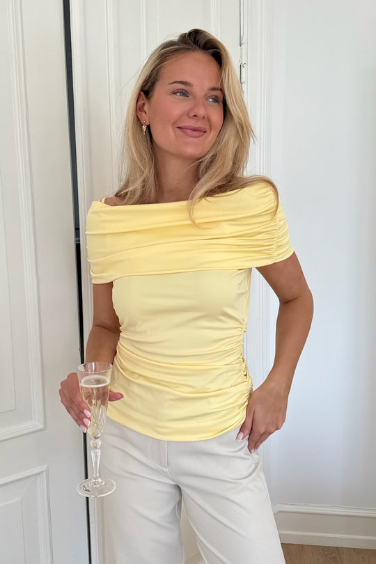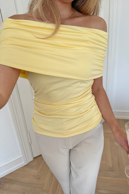 Vacker off shoulder-topp i gult. Toppen är tillverkad i ett härligt stretchigt tyg som ger den ett elegant och figurnära utseende runt kroppen. Den har volangdetaljer längs sidan och på axeln för en feminin touch.