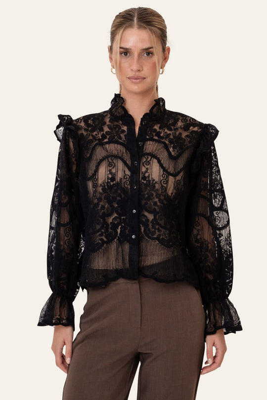 En elegant svart spetsskjorta med lös passform, prydd med djärva spetsdetaljer. Ärmsluten är avslutade med volanger och en elastisk kant, vilket ger ärmarna en mjukt puffig look. Fina volanger framhäver även axlarna och den höga kragen, vilket ger en raffinerad och feminin touch. Skjortan har en heldäckande button-down-knäppning framtill för mångsidig styling.