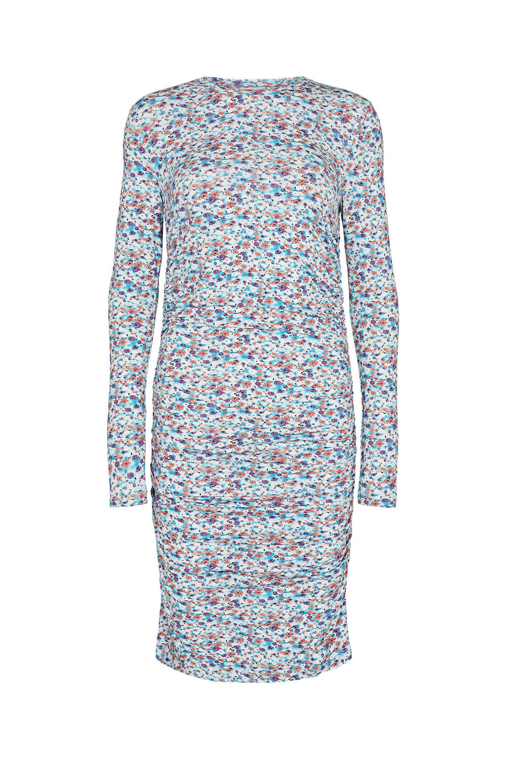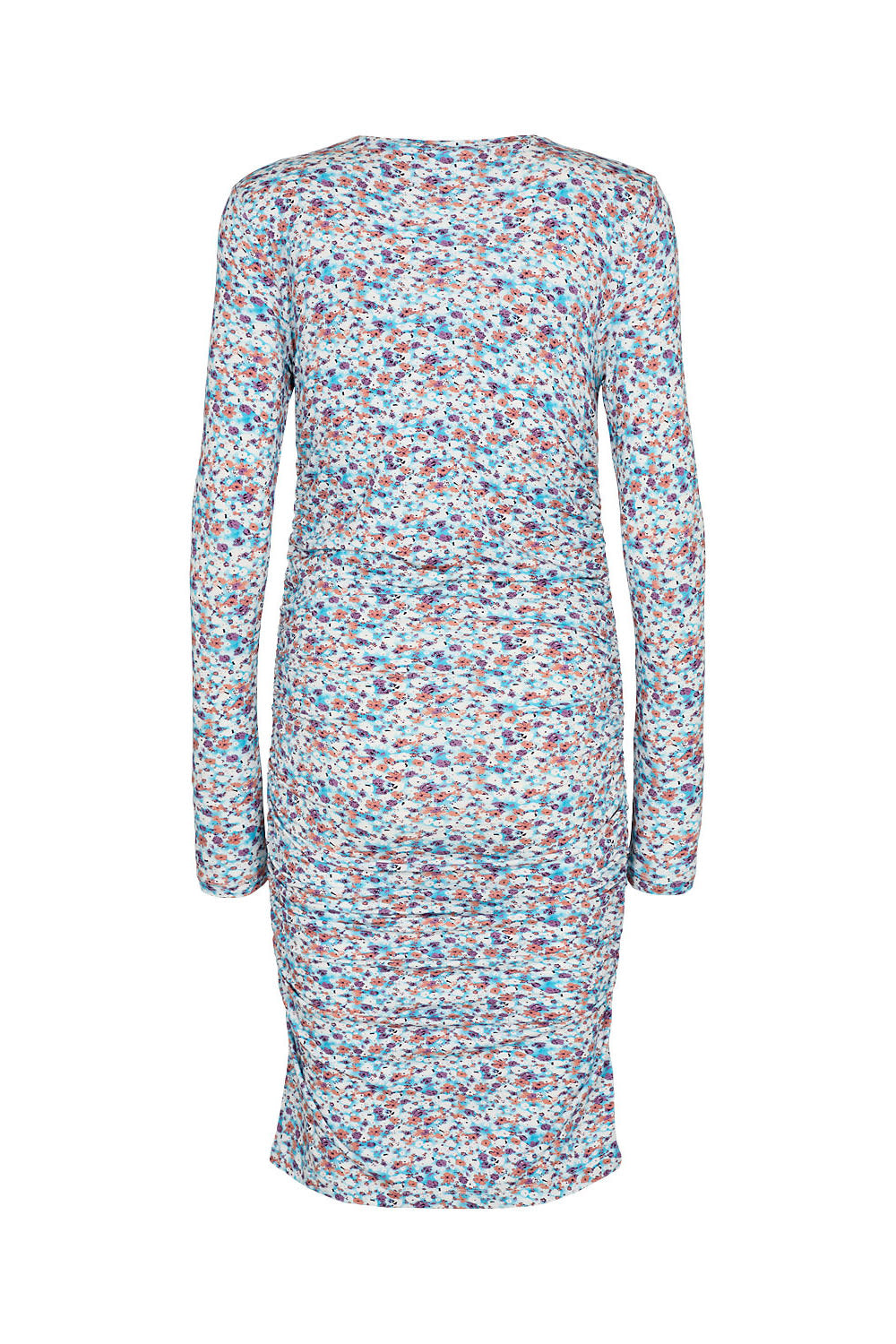 Our favorite Beala dress in blue with beautiful colored flowers and ruching details to make a perfect fit.