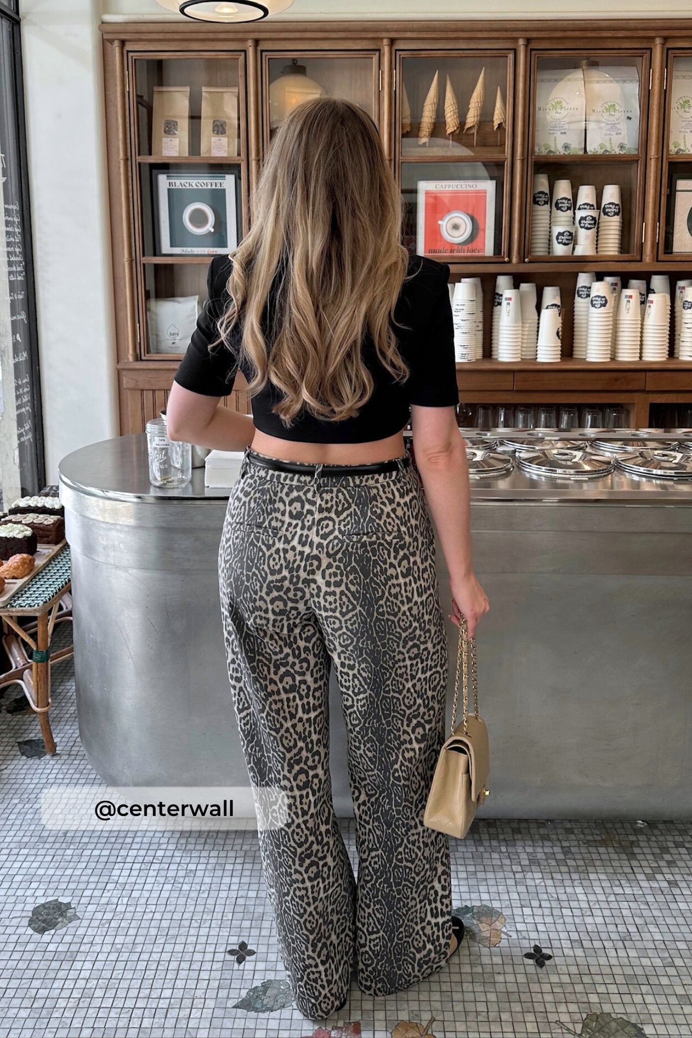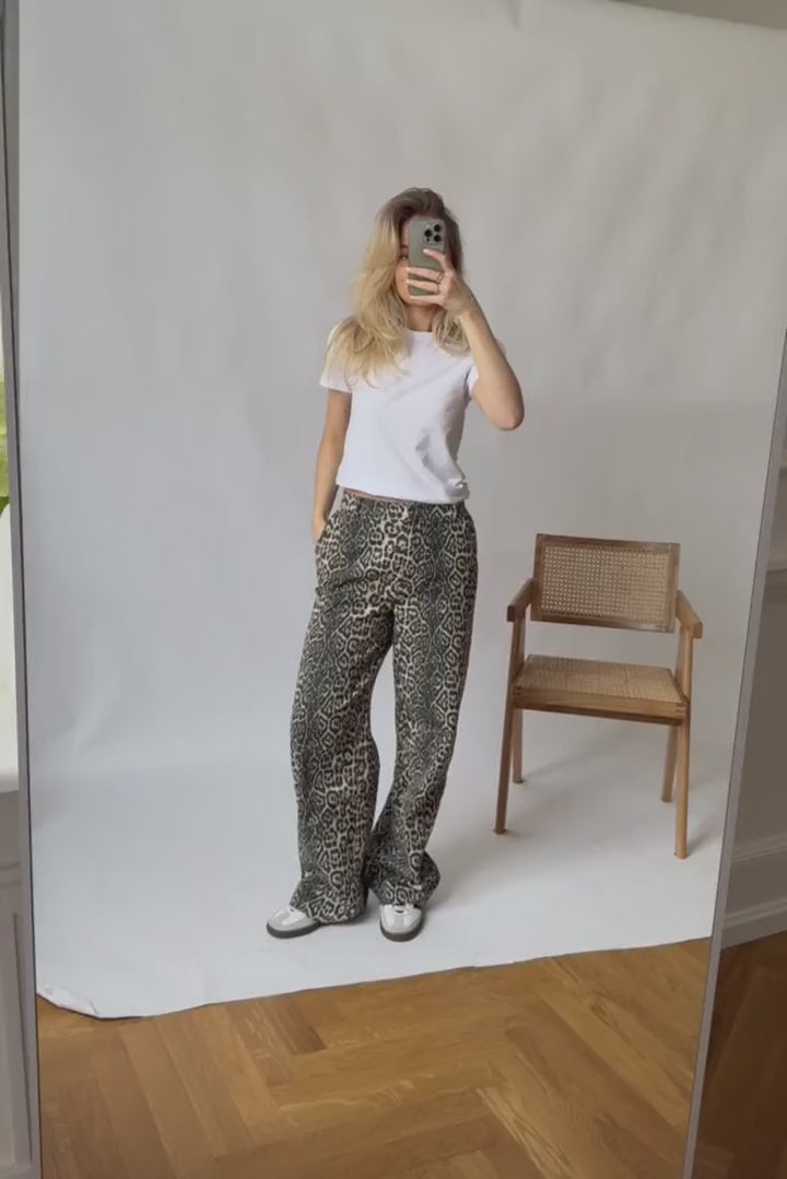 Leotryckta byxor med vida ben, bältesband och fickor.