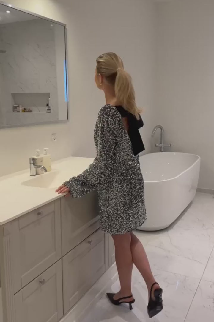 Short sequin dress with long wide sleeves, a black silky bow and an invisible zipper on the back.