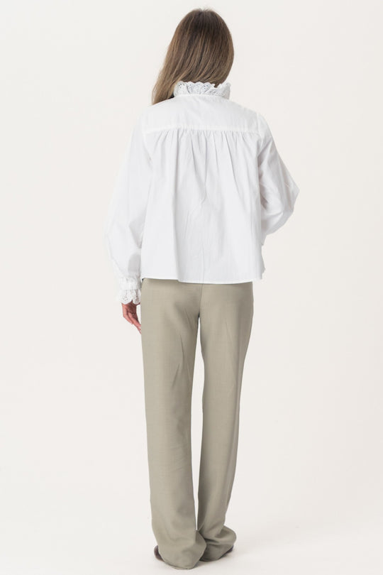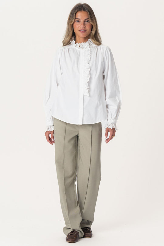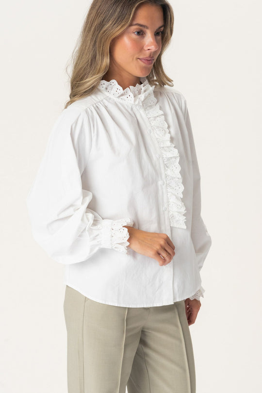 An elegant white shirt with a loose fit around the body for a relaxed yet refined look. It features long sleeves with elasticated cuffs that create a softly puffed silhouette, finished with delicate ruffle details. The shirt has a round neckline and a full button-down front closure. A ruffled trim frames both the neckline and the button placket, adding a romantic and feminine touch.