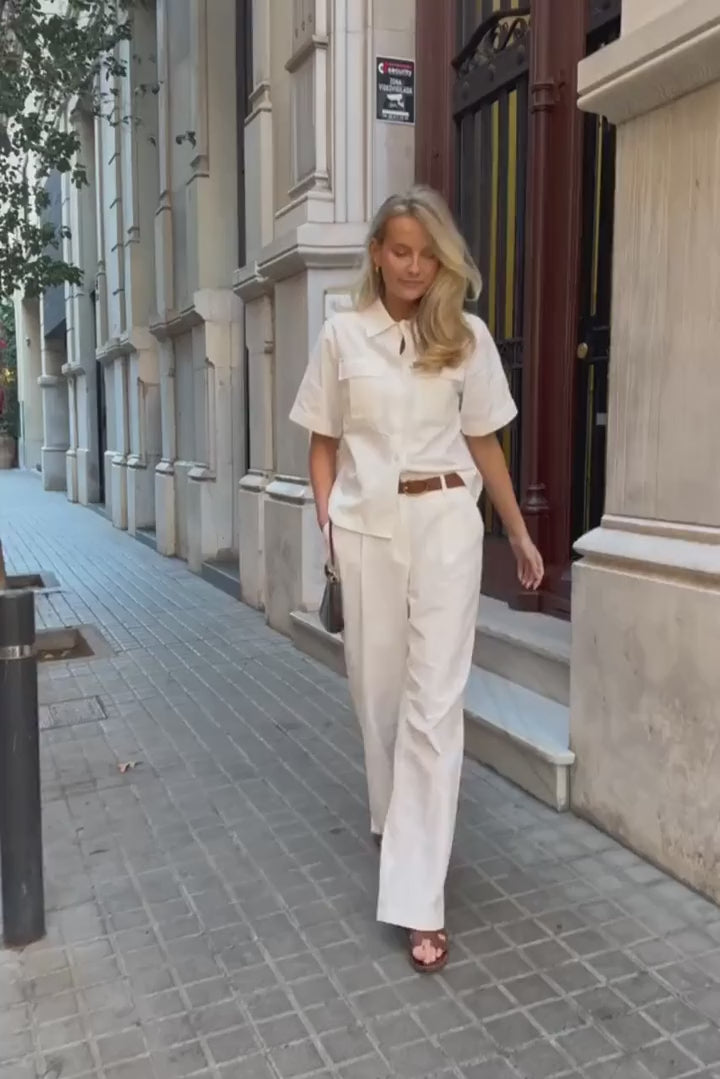 Vida, skräddarsydda byxor i vitt, tillverkade i linnelook, två framfickor och två fuskfickor bak. Matcha dem med Celina-skjorta eller väst.