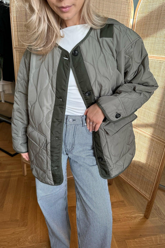 Quilted jacket with different tones of color, pockets and buttons as closure.