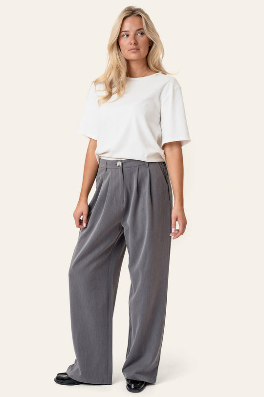 Vida, skräddade byxor i grått, två sidfickor och två fuskfickor bak. De har resår baktill och stängs med knapp och dragkedja.