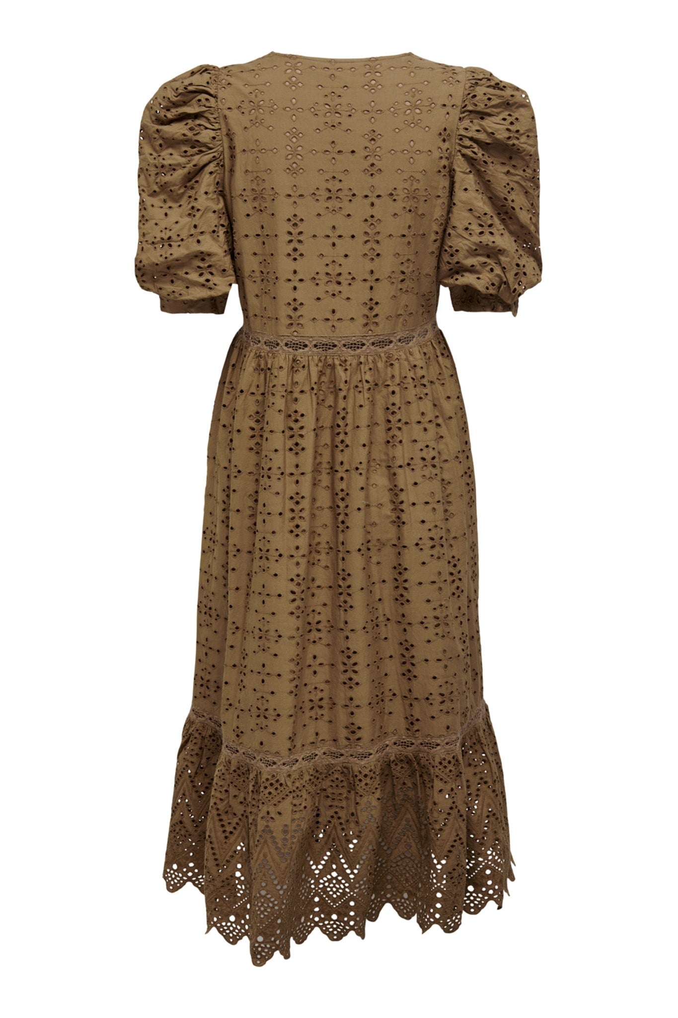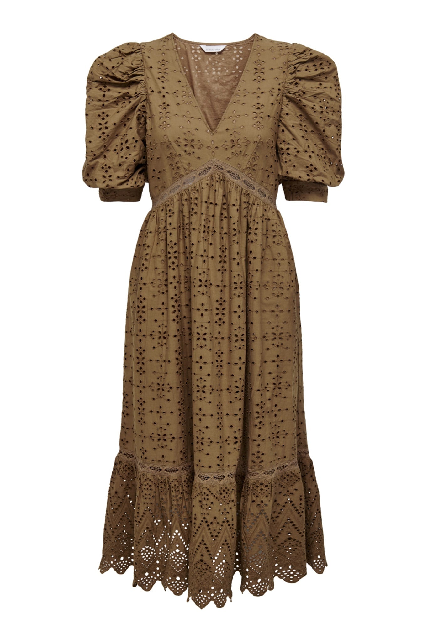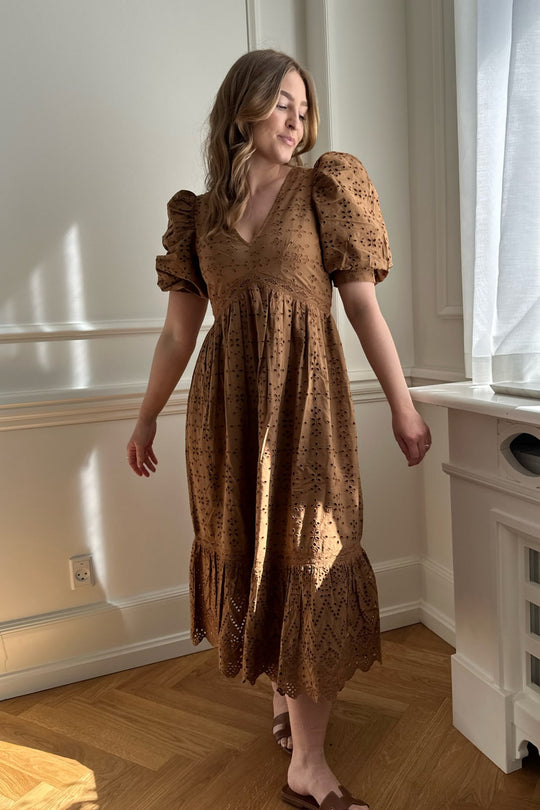 Brown dress with a material of embroidery, puffy sleeves and a romantic v-cut.
