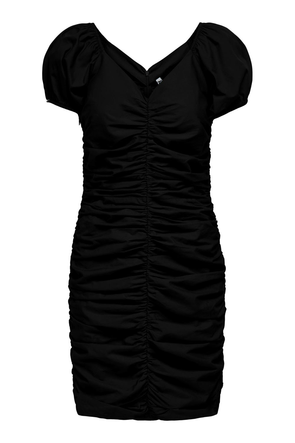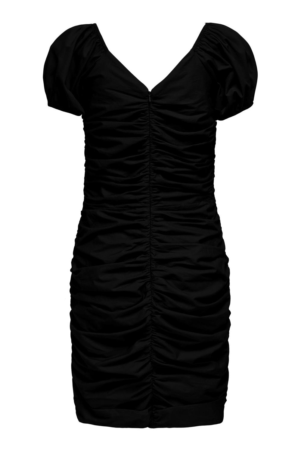 Beautiful black dress with short sleeves, ruching effect and a sweetheart cut.