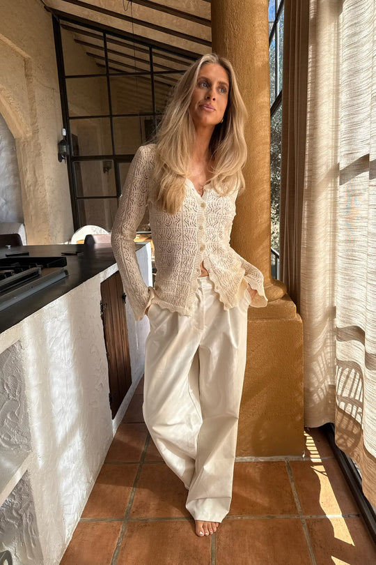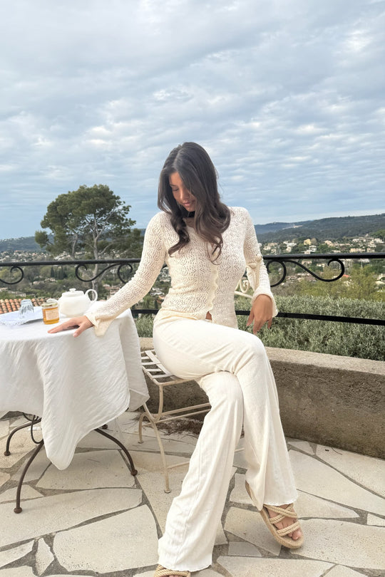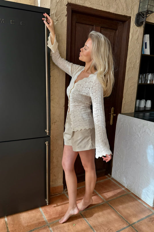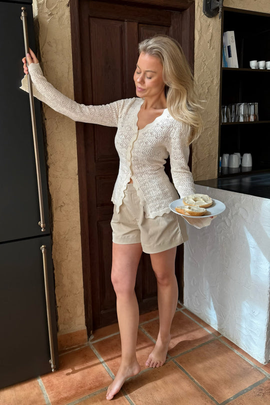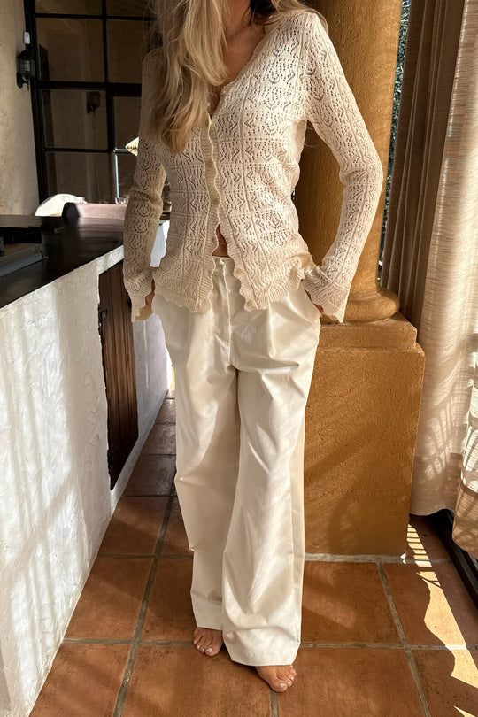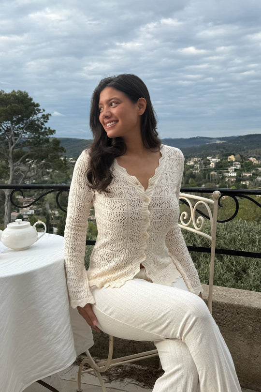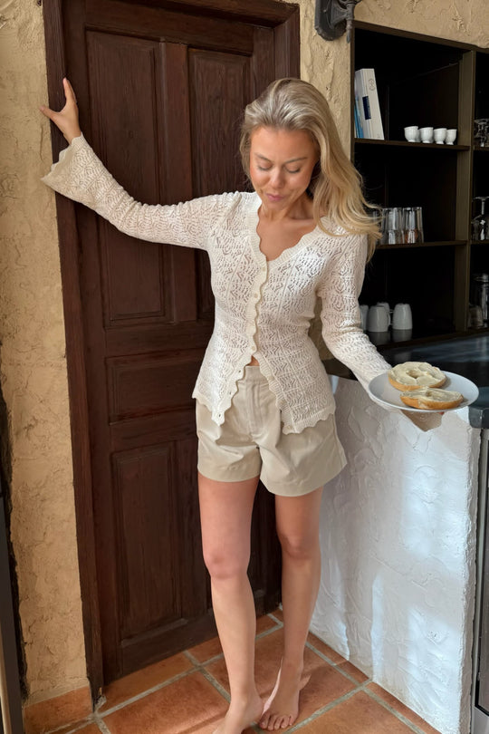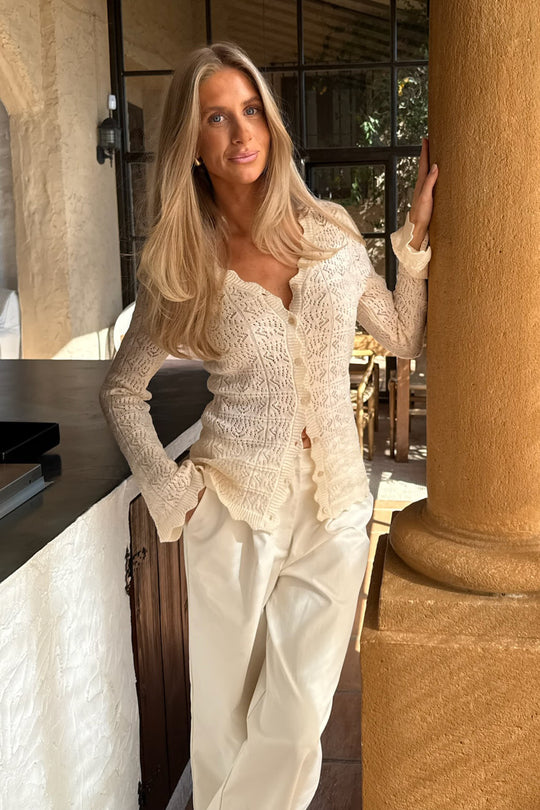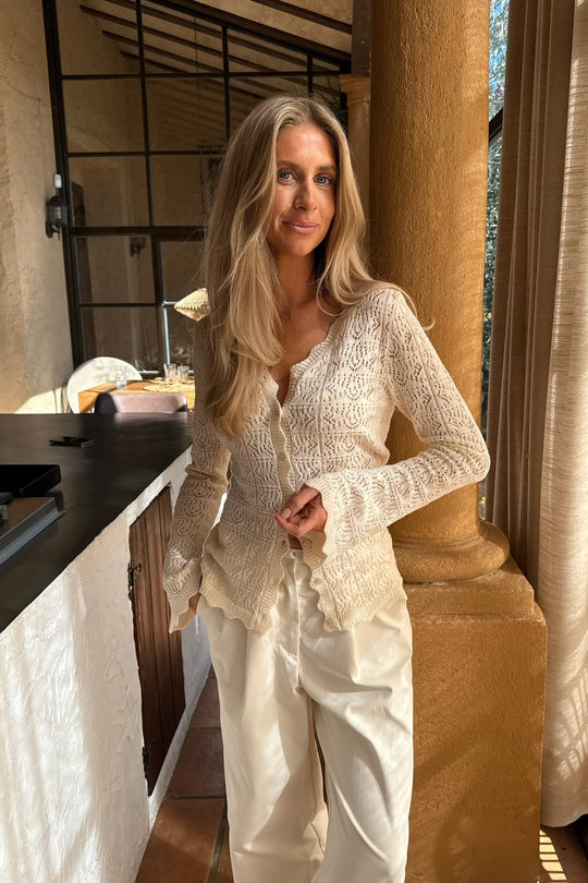 Vacker vit kofta med broderade detaljer och långa ärmar, V-ringning och knappar som stängning.