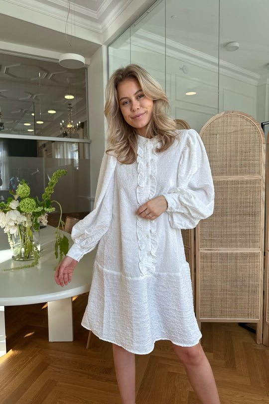 White dress in a loose fit, with ruffle details, structured material and long sleeves.