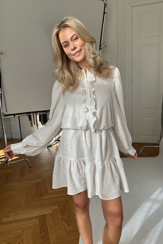 White dress with structured material, ruffle details in the front and with a loose fit, but has an elastic detail around the waist.
