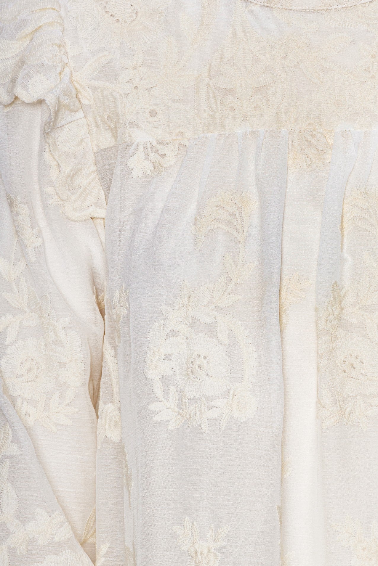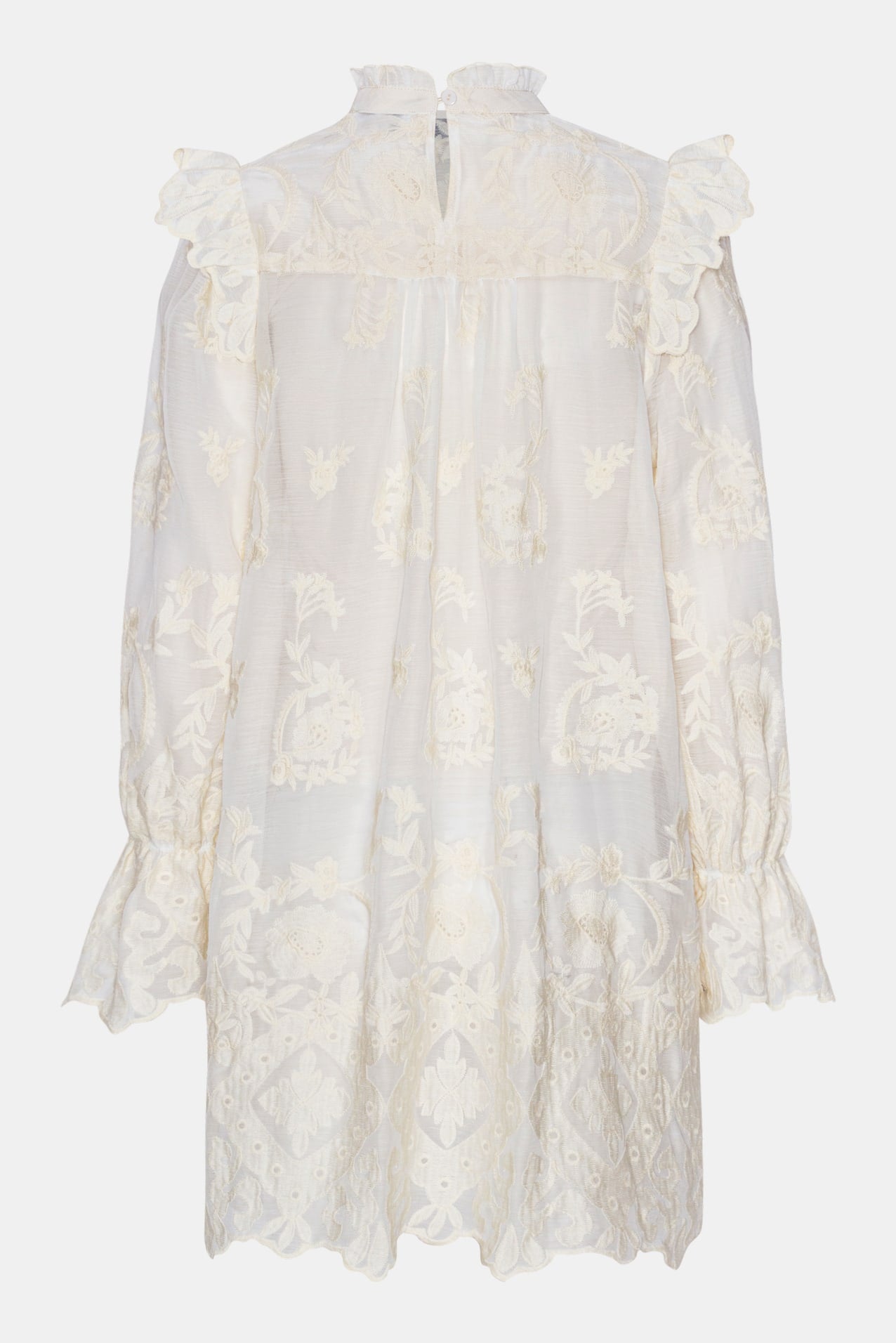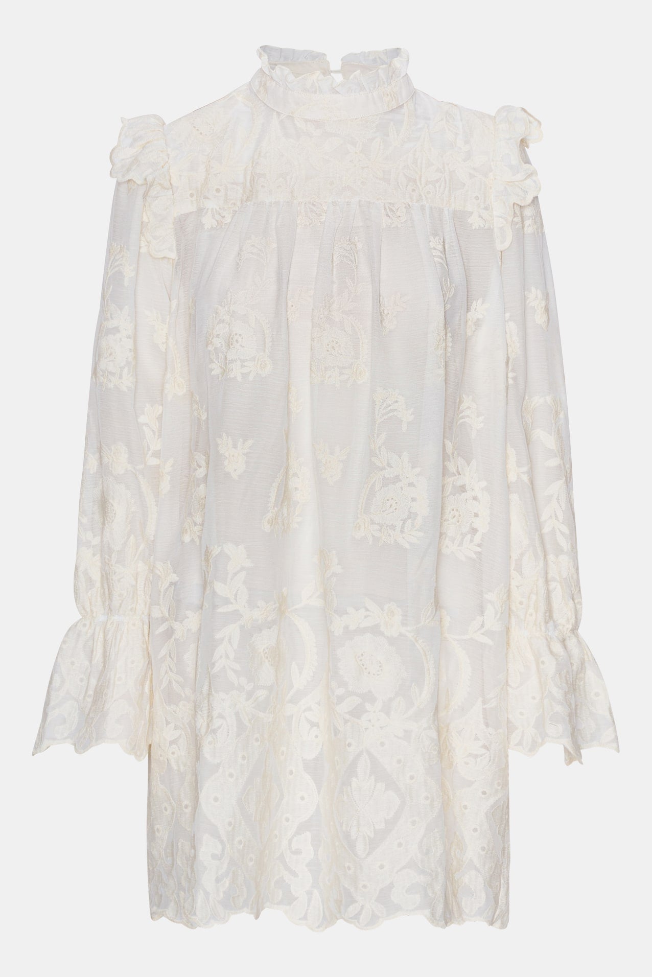En elegant vit spetsklänning med avslappnad passform och raffinerade volangdetaljer. Ärmarna har volangkanter och en elastisk manschett, vilket ger dem en mjukt puffig look. Fina volanger dekorerar även axlarna och den höga kragen, vilket ger en sofistikerad och feminin touch. Klänningen knäpps bak i nacken med en liten knapp.