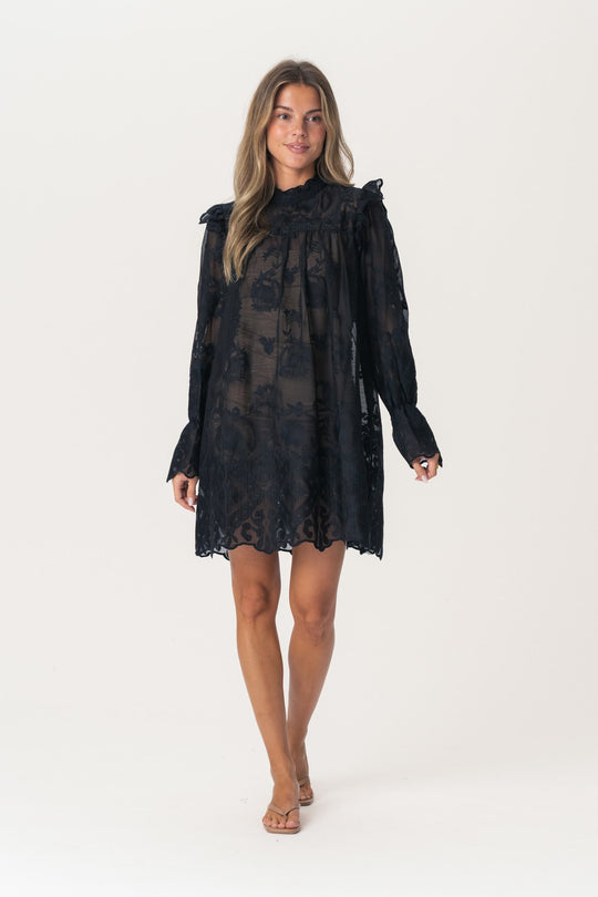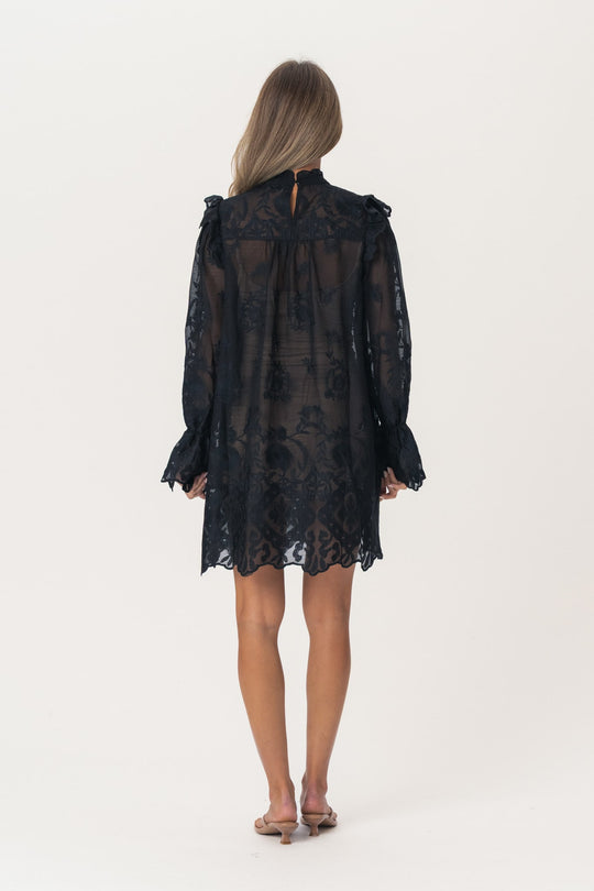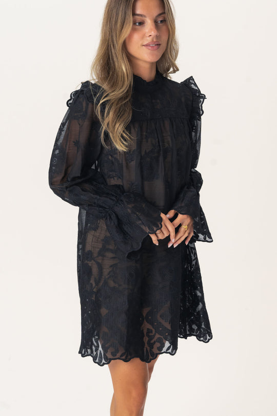 Kort transparent spetsklänning med unik vintagelook, volangdetaljer, långa ärmar och hög hals. Matcha den med en separat underklänning.