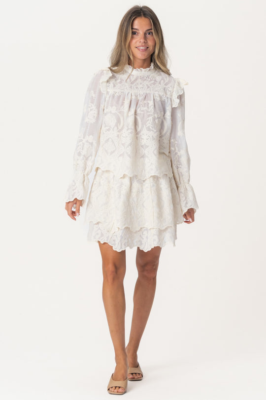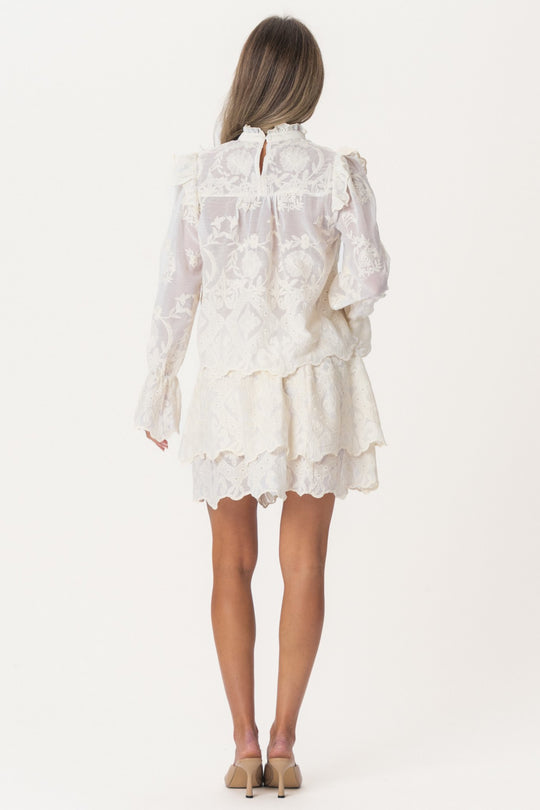 An elegant white lace shirt with a relaxed fit and refined frill details. The sleeves are finished with ruffled edges and an elastic cuff, giving them a softly puffed look. Delicate frills also decorate the shoulders and the high collar, adding a sophisticated and feminine touch. The shirt fastens at the back of the neck with a small button.