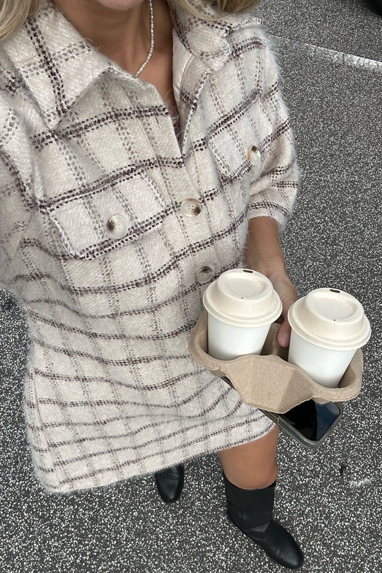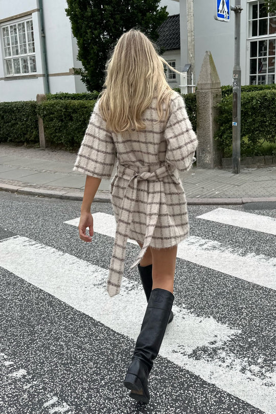 Soft shirt dress in beige brown checks with buttons down the front and a tie in the waist. It got two chest pockets and two side pockets.