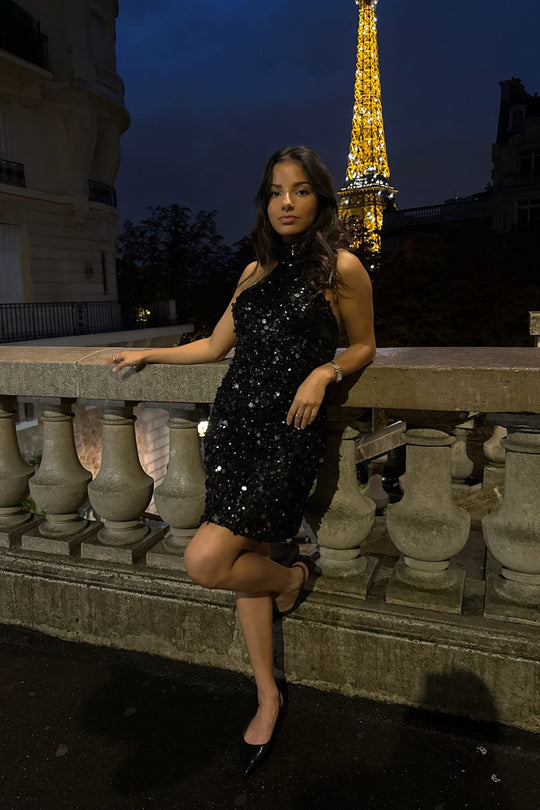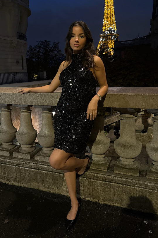 Figurnära halterneckklänning i svart paljett med urringning och knappar som knäppning bak i nacken. Den är stretchig och har foder.