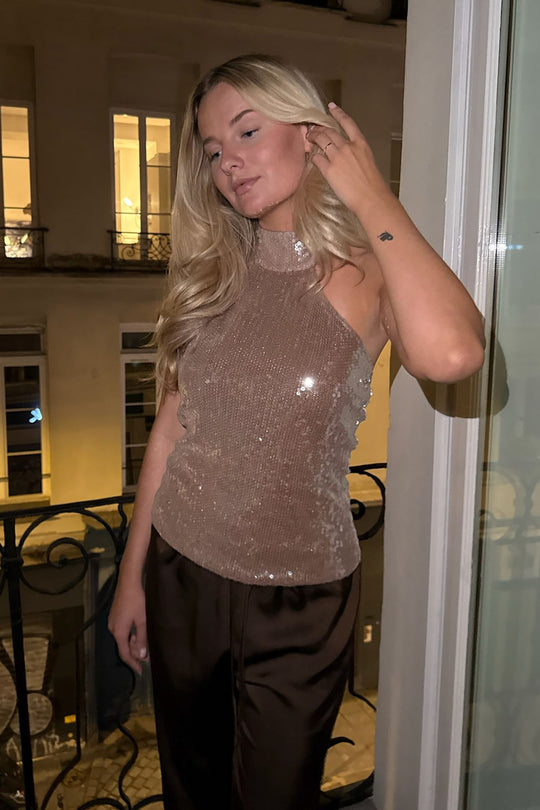 En glittrande halterneck-topp i en fantastisk ljusbrun nyans, helt prydd med skimrande paljetter. Toppen har en elegant, figurnära silhuett med en mjukt draperad effekt som smickrar kroppen vackert. Den höga halsringningen knäpps bak med två fina knappar, vilket ger en raffinerad finish och säkerställer en perfekt passform. Den öppna ryggen förstärker den eleganta, feminina looken, medan det mjuka, stretchiga tyget ger komfort och avslappnad glamour. Matcha den med den matchande paljettkjolen för ett komplett festset, eller styla den med svarta byxor för en elegant och modern kontrast.