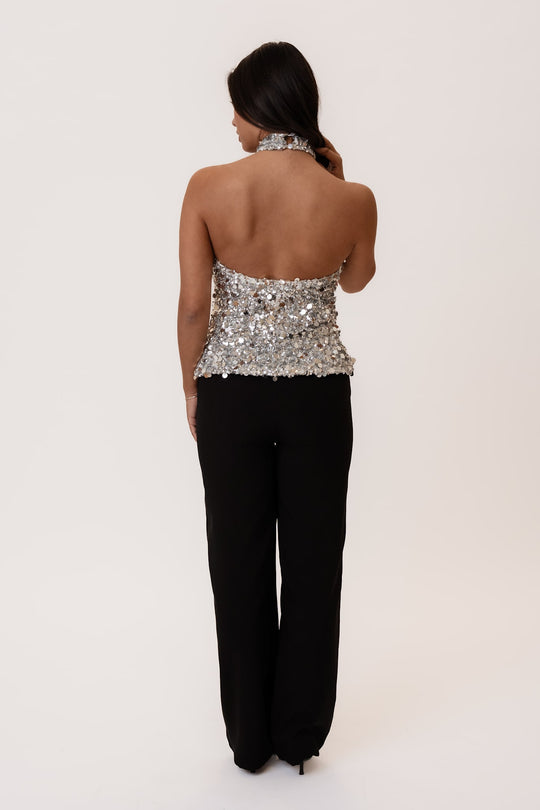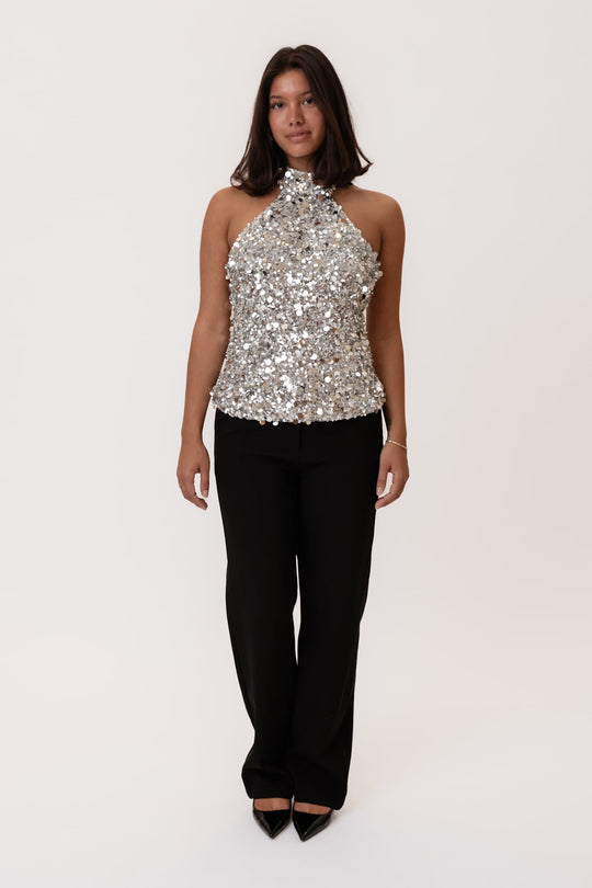 En iögonfallande halterneck-topp täckt med skimrande silverpaljetter som vackert reflekterar ljuset och skapar en lyxig festlook. Toppen har en elegant hög halsringning och en smickrande, figurnära silhuett som framhäver figuren. Den öppna ryggen ger en sofistikerad och sensuell touch, vilket gör den idealisk för speciella tillfällen. Den är fodrad för extra komfort och har en lätt stretch för att säkerställa en perfekt passform. Knäppningen med två knappar vid halsringningen ger en ren och snygg finish. Styla den med den matchande paljettkjolen för ett komplett, glamoröst set – eller kombinera den med svarta byxor och klackar för en elegant och modern kvällslook.