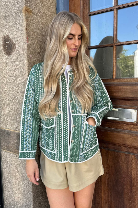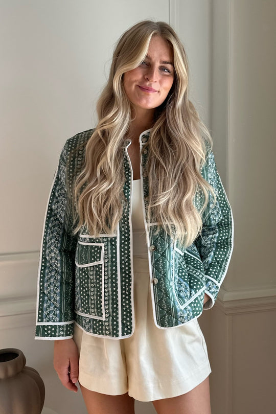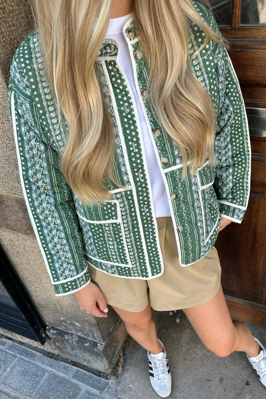 Green quilted jacket in an oversized fit with flower print, two big pockets and buttons down the front.