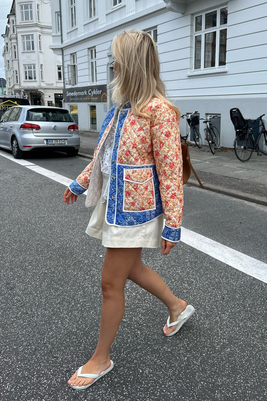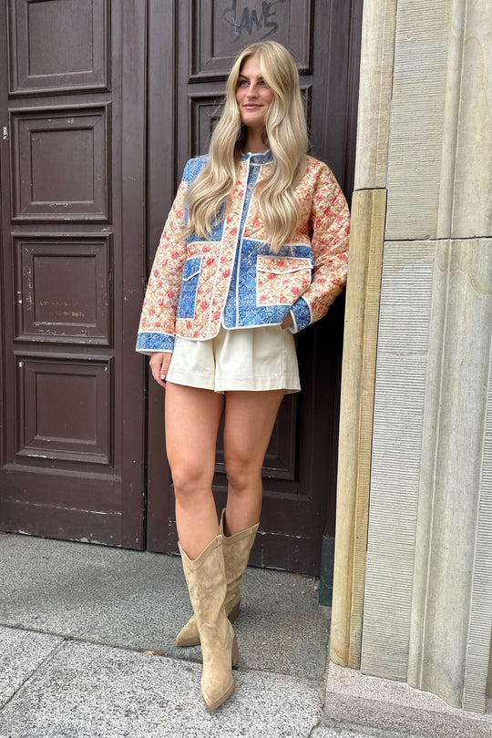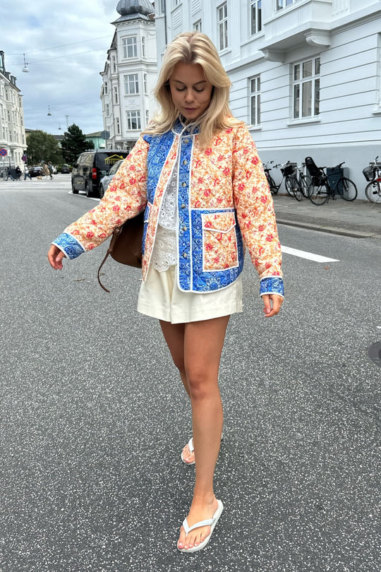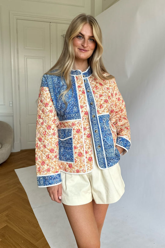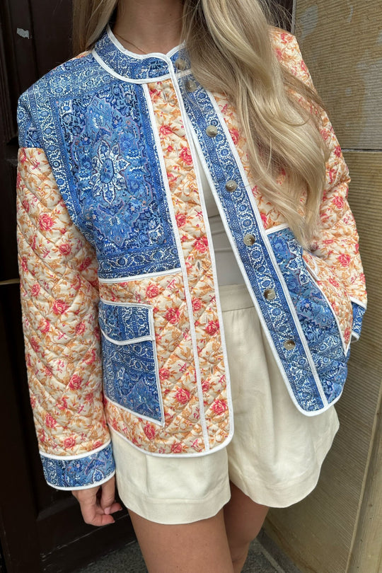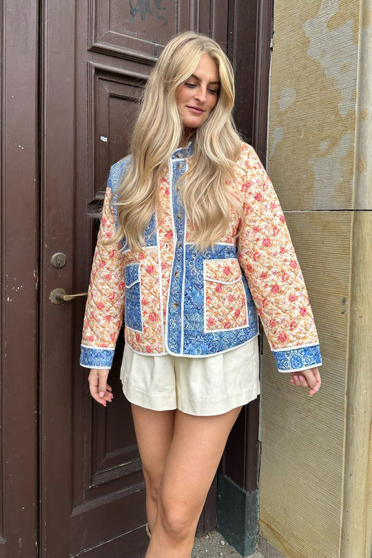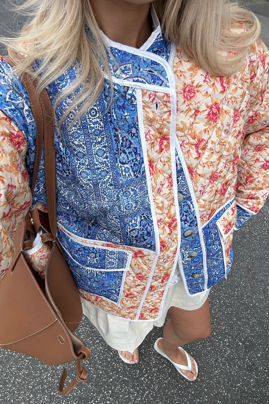 Rose, blue quilted jacket in an oversized fit with flower print, two big pockets and buttons down the front.