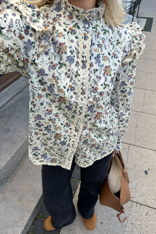 Beige shirt with multicolor flower print, frills on the cuffs, shoulders and collar. It has buttons down the front and a lace edge around the shirt.