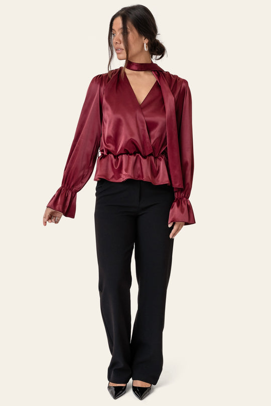 En vacker blus i bordeaux satin. Blusen har en avslappnad passform med en markerad midja, långa ärmar och en djup V-ringning med omlottdetalj och fina volanger. De långa ärmarna är avslutade med resår i ärmsluten, vilket skapar en subtil volang och ger ärmarna en mjukt puffig siluett. Blusen har ett knytbälte som kan bäras i midjan eller stylas som ett halsband för en extra touch.