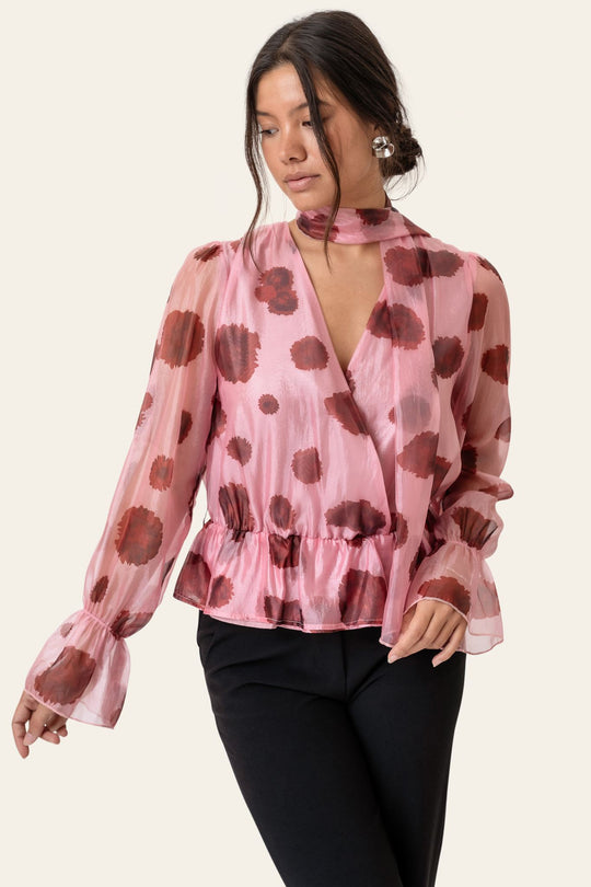 En vacker blus i rosa med ett rött blommönster. Blusen har en avslappnad passform med en markerad midja, långa ärmar och en djup V-ringning med omlottdetalj och fina volanger. De långa ärmarna är avslutade med resår i ärmsluten, vilket skapar en subtil volang och ger ärmarna en mjukt puffig silhuett. Blusen har ett knytbälte som kan bäras i midjan eller stylas som en halsaccessoar för en extra touch.