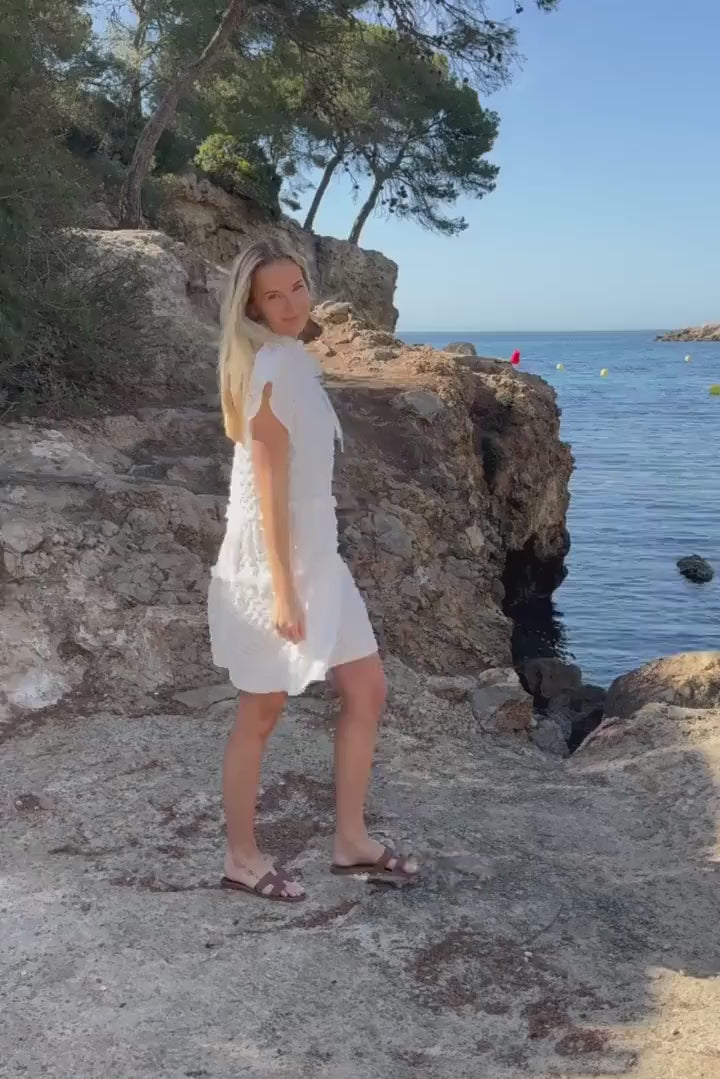 Kortärmad klänning i bubbelstruktur med volangdetaljer, tre små knappar och knytband i nacken.