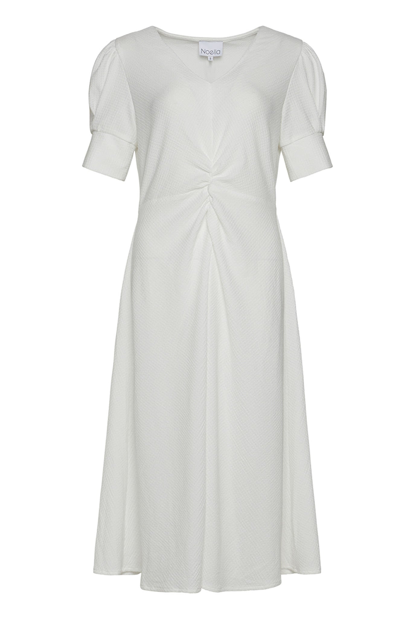 Beautiful white dress with short sleeves and structure in the fabric. It got a cute wrinkle detail in the front and a v-neckline.