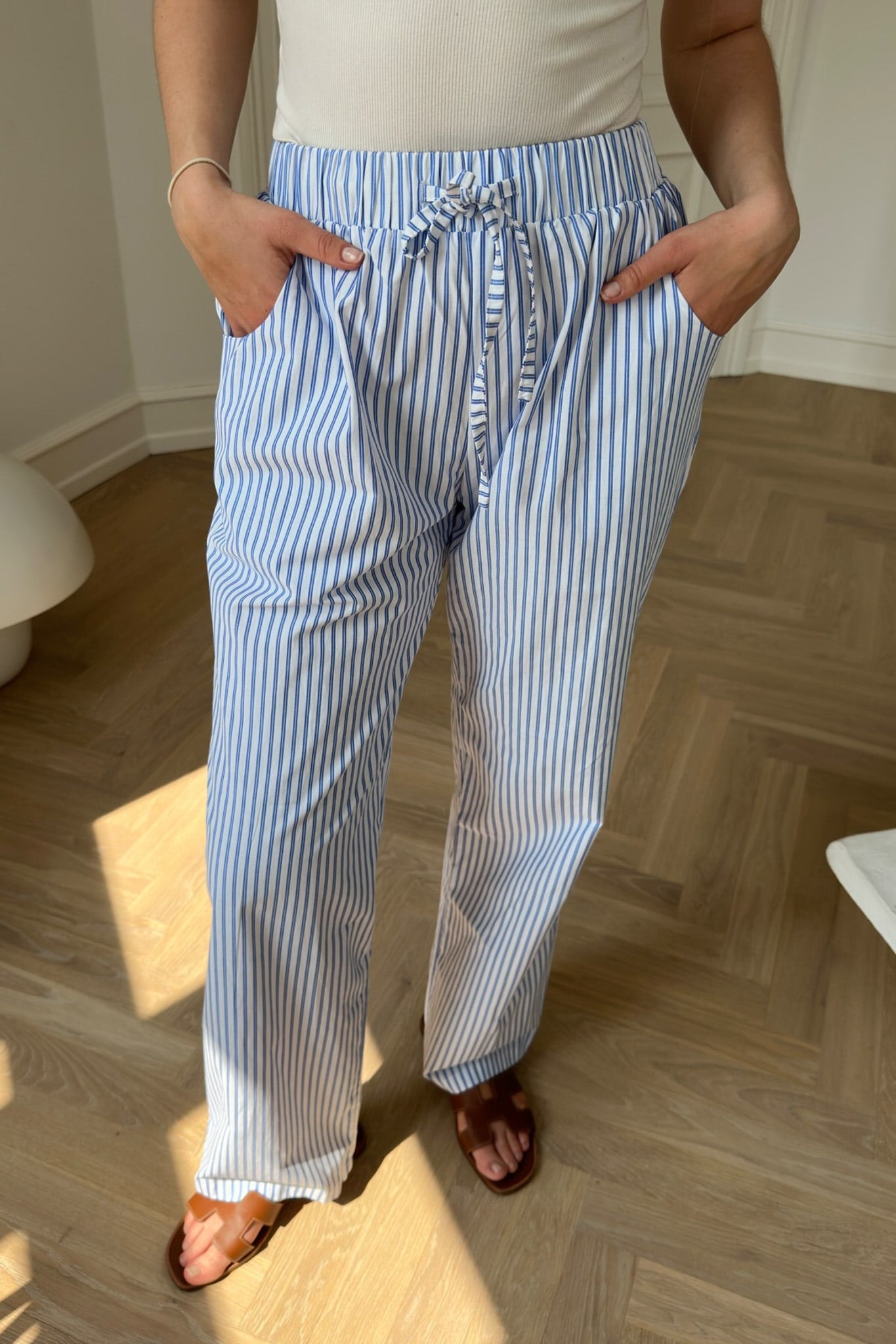 White and blue striped pants with pockets on each side and has a regular tie around the waist. Style it with our Hannah shirt.