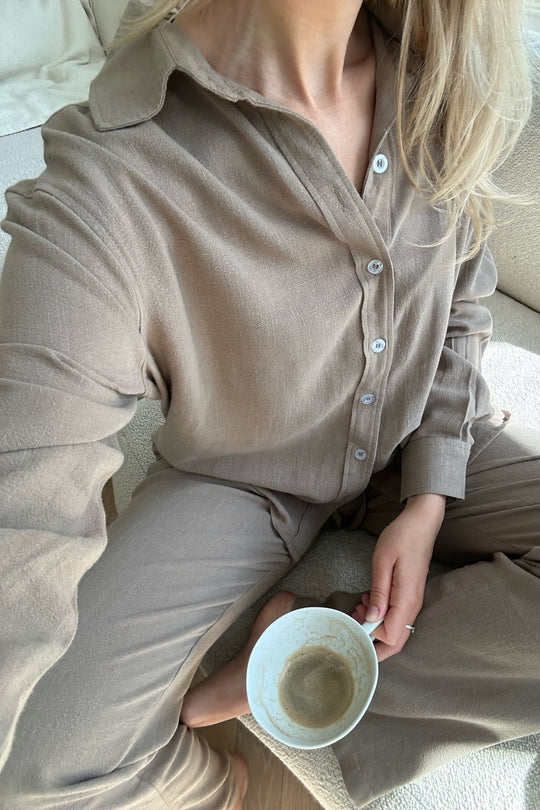 Basic, linen shirt in brown with buttons and a collar. Match it with our Hannah pants.