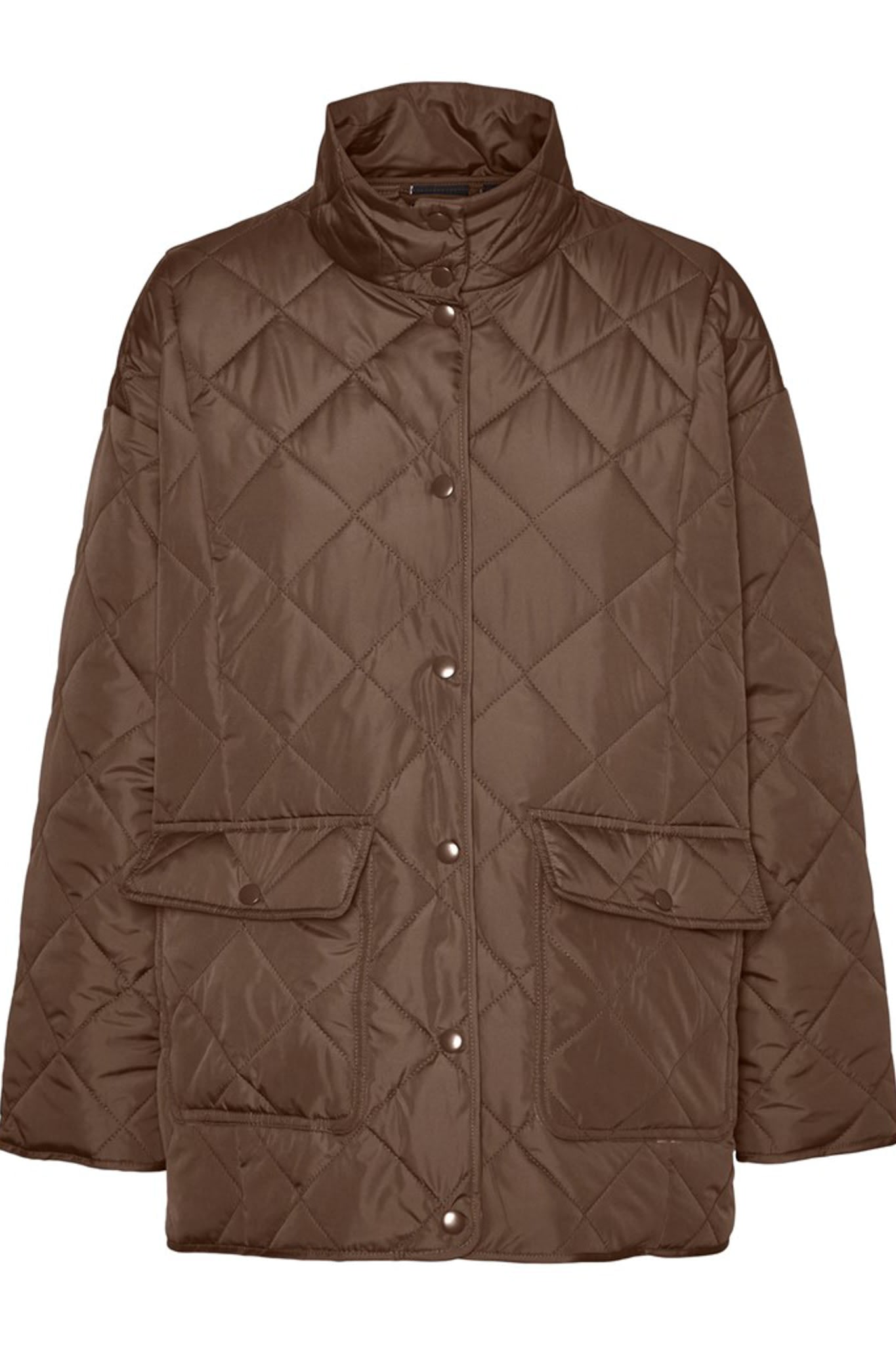 Quilted jacket with high neck, buttons as closure and big pockets on the front.