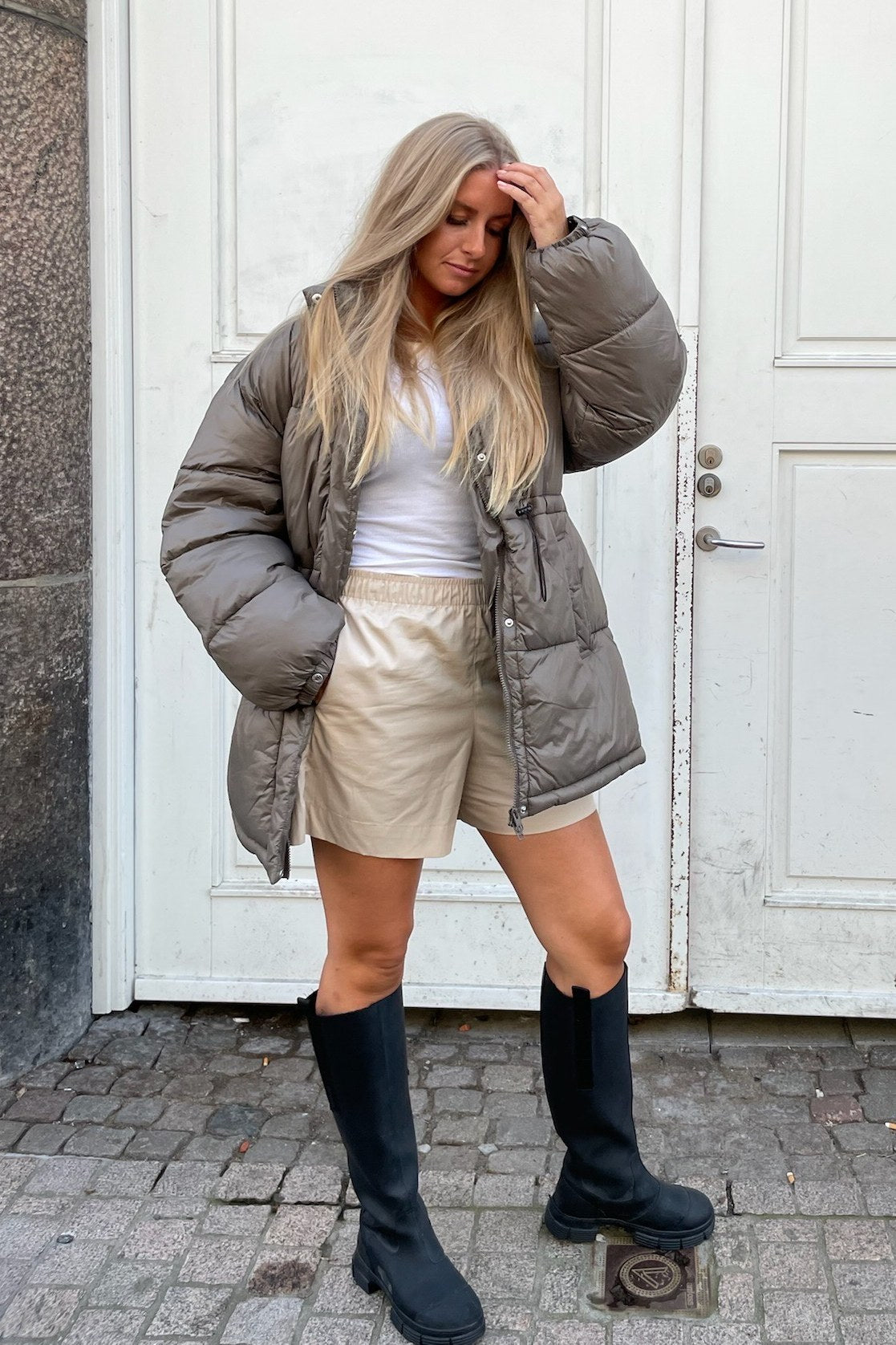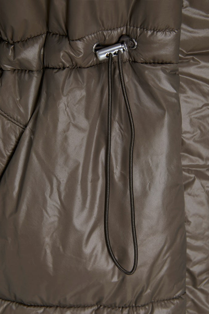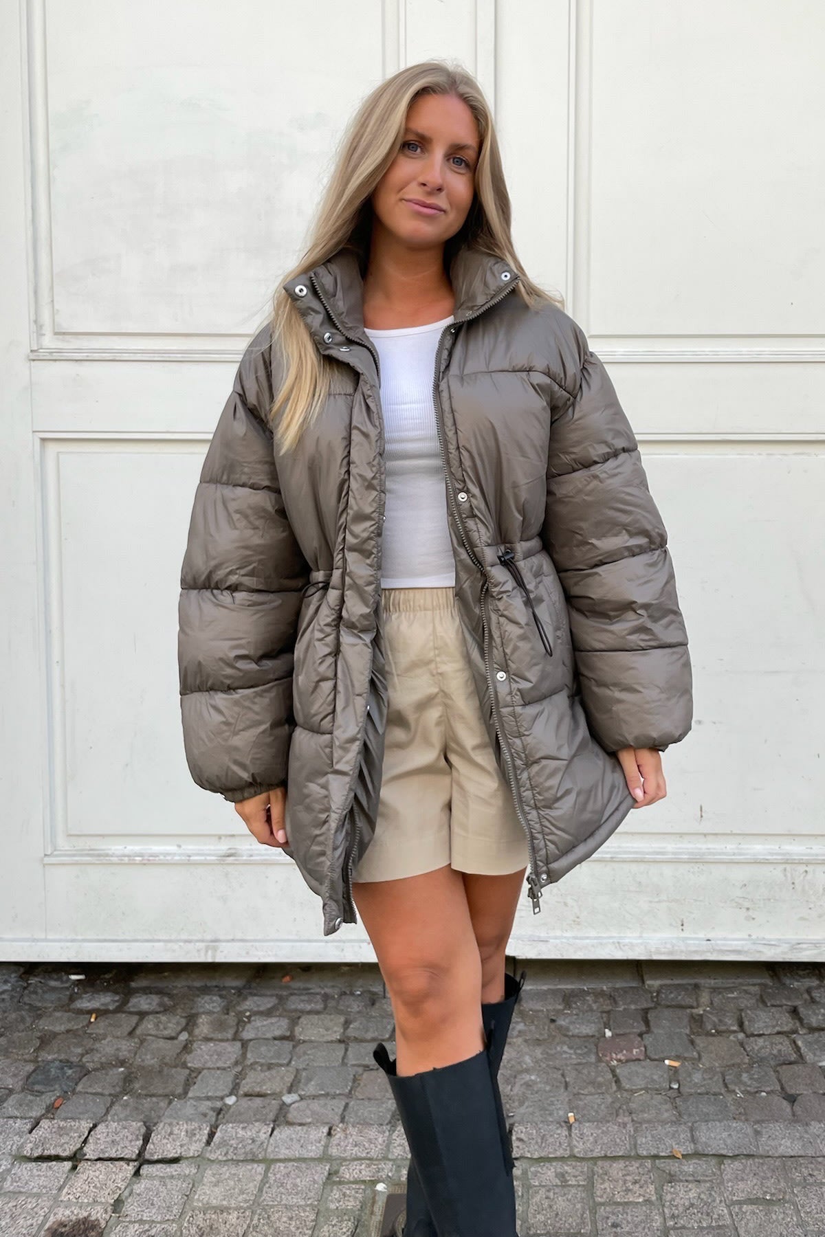 Beautiful and warm shiny puffer jacket in brown with elastic in the waist for a more feminine look.