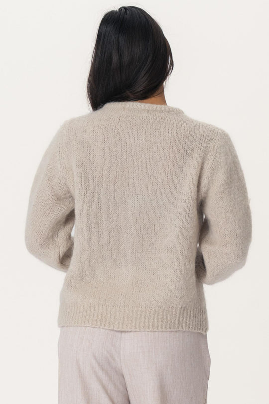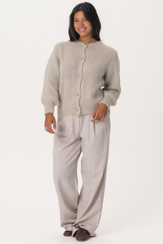 A beautiful fuzzy mohair cardigan in soft beige. The cardigan features long sleeves finished with wide, fitted ribbed cuffs that give the sleeves a softly puffed look. A matching wide ribbed trim is also found at the hem and around the round neckline, creating a voluminous silhouette when the cardigan is buttoned up. It closes down the front with elegant, pearl-like buttons for a refined touch.