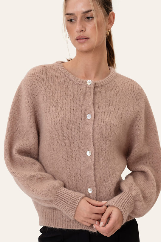 En vacker fuskig mohairkofta i mörkbeige. Koftan har långa ärmar med breda, åtsittande ribbade muddar som ger ärmarna ett mjukt puffigt utseende. En matchande bred ribbad kant finns också vid fållen och runt den runda halsringningen, vilket skapar en voluminös silhuett när koftan knäpps upp. Den stängs framtill med eleganta, pärlliknande knappar för en raffinerad touch.
