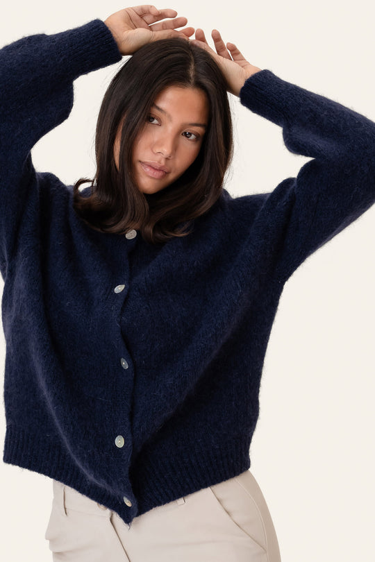 En vacker fuskig mohairkofta i marinblått. Koftan har långa ärmar med breda, åtsittande ribbade muddar som ger ärmarna ett mjukt puffigt utseende. En matchande bred ribbad kant finns också vid fållen och runt den runda halsringningen, vilket skapar en voluminös silhuett när koftan knäpps upp. Den stängs framtill med eleganta, pärlliknande knappar för en raffinerad touch.